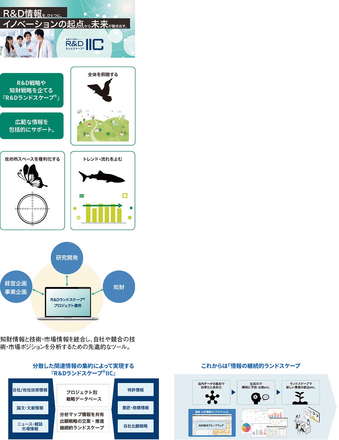 『アイ・ピー・ファイン株式会社』の『R&DランドスケープⓇIIC』は、特許・論文からニュースまで散在する情報を集約し、研究開発・知財・企画が同じ地図で意思決定できるグループウェアだ。AIが要約や分類を担い、競合動向や技術テーマの伸びをマップ化。社内報告書も重ねれば、自社の強みや空白領域を「会議前に見える形で簡単に揃える」ことが可能だ。
