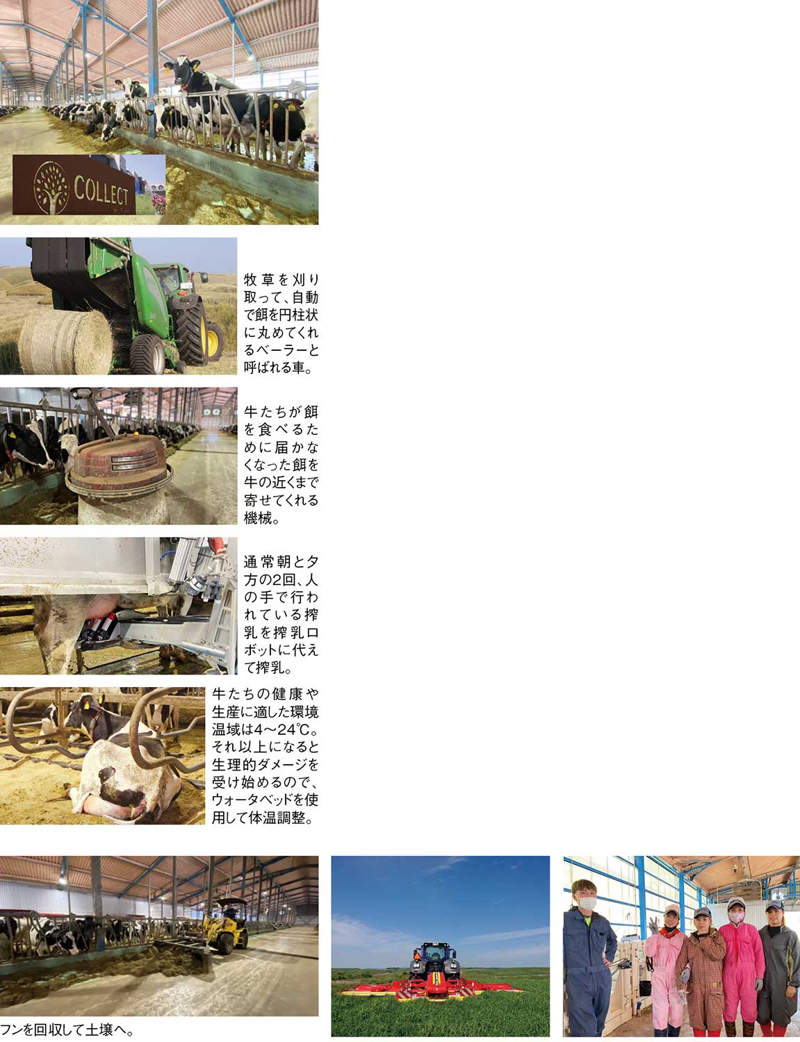 世界最大級のカルデラが広がる熊本県阿蘇市で、約200haの牧場と約千頭の乳牛を飼育する『株式会社COLLECT』。自家栽培の栄養豊富な牧草や牛の体温調整に役立つウォーターベッドを導入するなど牛の健康管理に細やかに配慮している。さらに、人の作業負担を減らすため、搾乳ロボットや自動餌寄せ機、牧草の刈取・梱包を行うベーラーなどを導入し、牧場のオートメーション化を推進している。