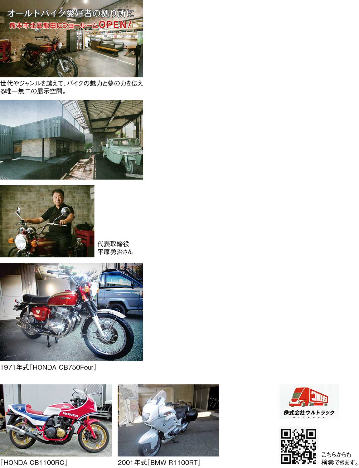 熊本市の『株式会社ウルトラック』が手がけるビンテージバイク展示ショールームは、代表取締役の平原勇治さんが長年温め続けてきた趣味の夢を形にした特別な空間。幼少期から憧れ続けた名車、時代を超えて愛される希少モデル、独自の美意識で選び抜いた珠玉の一台一台が、整然と、そして迫力ある演出で並ぶ。単なる展示にとどまらず、車両の背景にある歴史やストーリー、当時の技術、デザインの変遷まで丁寧に紹介。バイクファンはもちろん、初めて触れる人でも奥深い世界観を体感できる構成となっている。長年、大型車や特装車を扱い培ってきた確かな整備力と審美眼を生かし、コンディション管理やレストアにも徹底的にこだわることで、往年の名車本来の魅力を最大限に引き出す。細部に宿る美しさと力強さは、ものづくりへの敬意と情熱の証だ。訪れる人に新たな憧れと感動を与える場所だ。