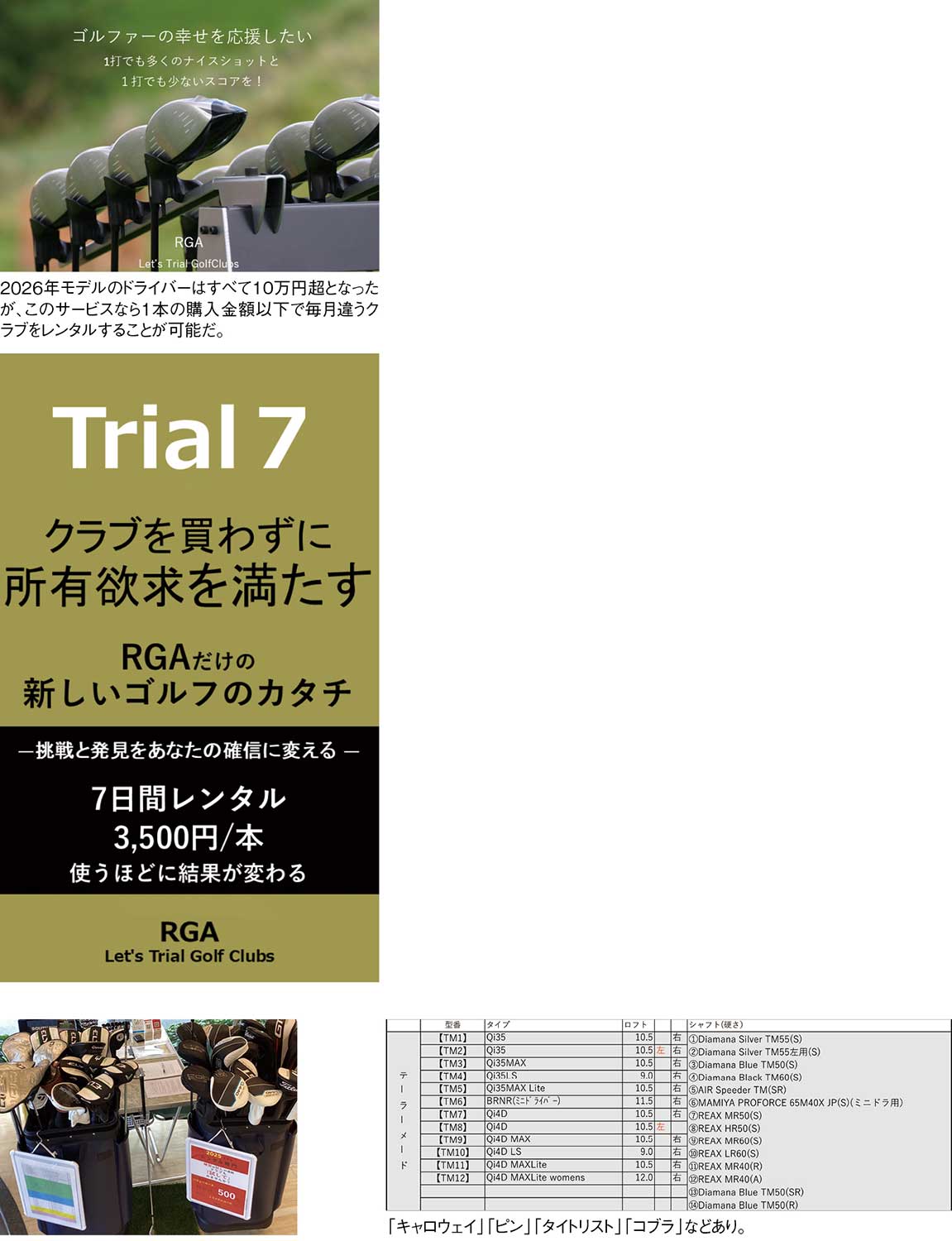 『RGA(Let’s Trial GolfClubs)とは、これまでのゴルフクラブを「所有」からレンタルサービスの「借りる」に変える新しいカタチ。練習では気軽に挑戦、ラウンドが決まればコースで確認。一つのクラブを使い込むも良し、いろいろチャレンジして楽しむも良し。ショップでの試し打ちやフィッティングとは違い、練習場で自分のペースで試せて、Trial7(7日間レンタル)では実際のラウンドで数値には表れないクラブとの相性を確認できる。アベレージゴルファーだけでなく、初心者からベテラン、レフティ、レディースまで自由にいろいろなクラブを試すことで、「自分のスイングに適応する本当の一本(Real Golfclubs to Adapt)」に出会える、それが『RGA』のコンセプト。このサービスは、アメリカ5大メーカーの最新ドライバーを全方位に用意。2026年モデルもこのサービスなら格安で毎月違うクラブでのゴルフが可能であり、すべてのゴルファーが持つ挑戦魂に応えつつ、クラブは所有するものという常識を覆すサービスだ。いよいよクラブは買わない時代がやってきた。