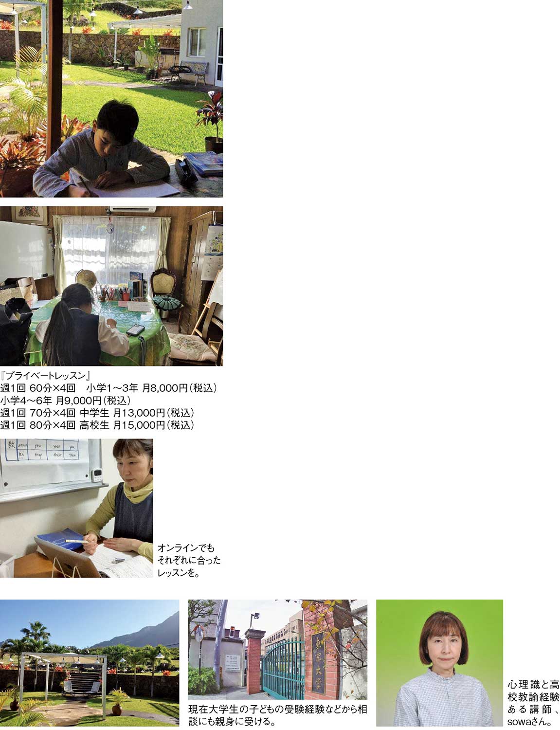 また、遠方にお住まい、通塾が難しい、などの方にはオンラインレッスンも実施。幼児・小学生の新しい言語習得の第一歩から、中高生の受験対策、英検対策まで目的とレベルに合わせてマンツーマンで指導。ハワイでの学びながらのホームステイも提案してもらえる。
