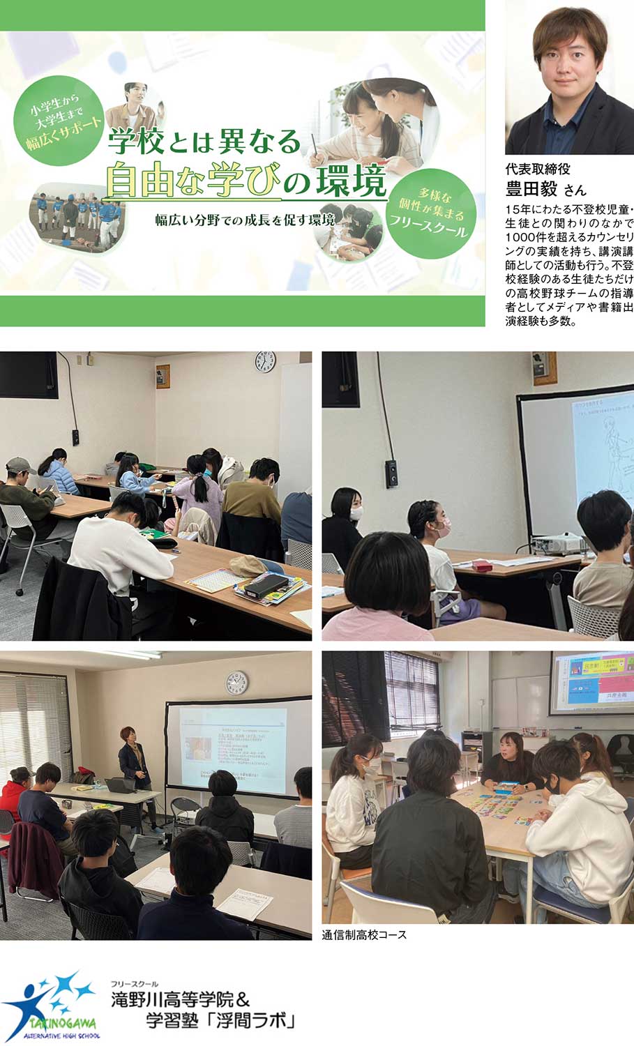 しかし、生徒数が増えるにつれ、システム的となっていく教育に疑問を抱き始めた豊田さんは、江戸時代の私塾のように一人の中心になる教員のもとに様々な個性を持った生徒が集まり、生徒と教員、生徒と生徒という、人のつながりによってお互いを高め合う学習環境を理想と考えた。そこで2019年、長年勤めた教職を退職。自らの思い描く理想の学びの場を形にするため『滝野川高等学院』を設立した。学校でもなく家でもない、「第3の場所」としての生涯学習施設は、すぐに注目を集め、開校からわずか5年で、都内でも有数の生徒数を抱えるフリースクールへと成長した。15年以上にわたり不登校の子どもたちと向き合い続け、カウンセリング実績は1000件を超える。現在はスクール運営に加え、講演講師としての活動も精力的に行なっている。