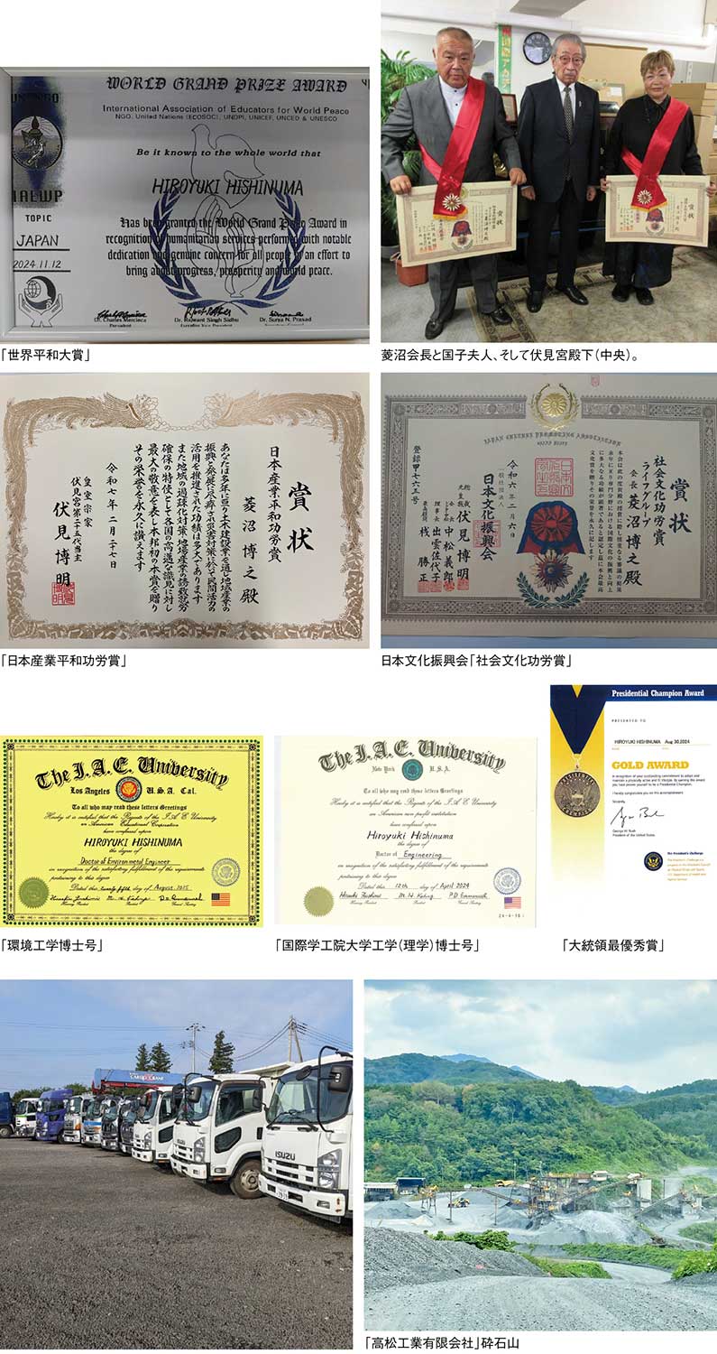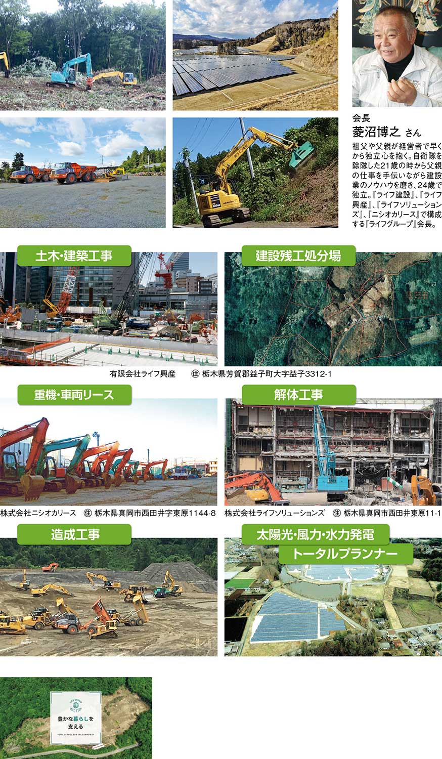 『ライフグループ』は、『ライフ建設』『ライフ興産』『ライフ開発』『ニシオカリース』の4社を牽引し、道路改良や河川改修、下水道整備、造成、外構工事といった土木・建築分野を基盤に、太陽光・風力・水力発電を中心とする再生可能エネルギー事業、重機・車両のリース事業まで、多岐にわたる事業を展開している。グループを率いる菱沼会長は、土木施工管理技士をはじめとする複数の国家資格を有し、安全管理や労務管理など幅広い分野で専門性を培ってきた。米国財団法人国際学士院から工学博士の称号を授与されるなど、その知見と歩みは国内外で高く評価されている。地域インフラの整備や環境保全に真摯に取り組み、「日本産業平和功労賞」「地域振興特別功労賞」「世界平和大賞」を受賞するなど、高く評価されている。