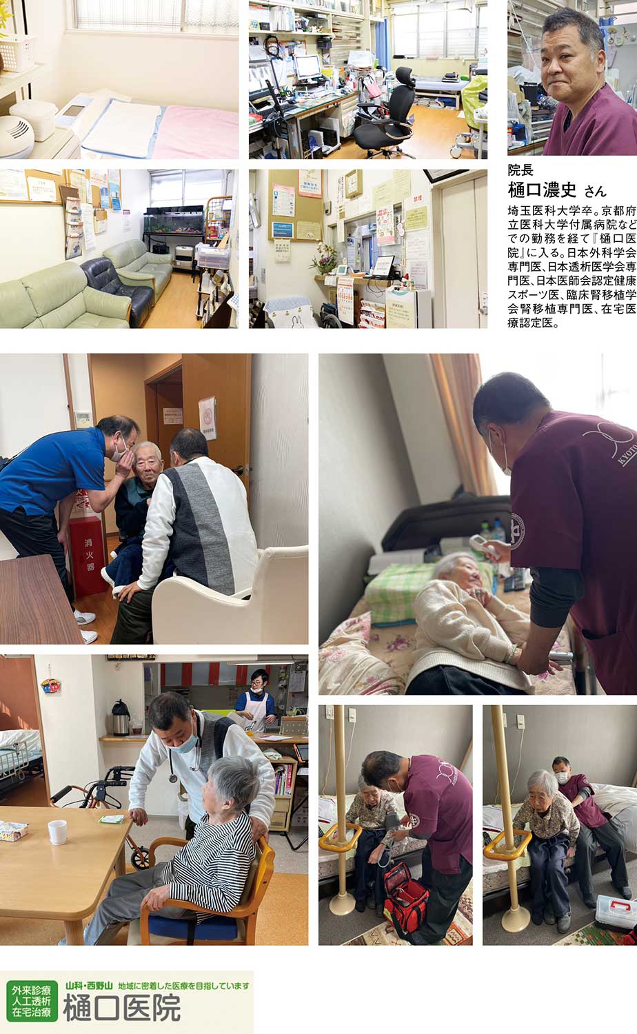 1970年、京都市山科区に開院した『樋口医院』は、半世紀以上に亘って地域住民の健康を支え続けてきた。現在、二代目院長として、その舵をとるのが樋口濃史さんだ。樋口院長が医師を志した原点には、先代医院長である父の存在がある。まだ、在宅診療が一般的でなかった時代から往診に力を注ぎ、患者さん一人ひとりの暮らしに寄り添う診療を続けてきた。樋口院長は父の車に乗って往診に同行することもあり、父が患者さんに大切に寄り添う姿を見て育ったという。「無理して医者になることはない。勉強したいなら医者になればいいが、食べるために医者になるのならやめなさい」と言われて育った樋口院長だったが、やがて父のような医者になりたいと思うようになり、医師の道を志した。埼玉医科大学で医学を学び、卒業後は京都府立医科大学附属病院や福知山市の病院などで研鑽を積んだ。その後、家業の樋口医院に戻り、父と共に診療にあたった。医学は常に進歩を遂げており、父の時代と現在では医療の在り方も異なる。父との衝突を繰り返しながらも父と同じ現場に立ち、同じ患者を診た経験はかけがえのない時間だったという。