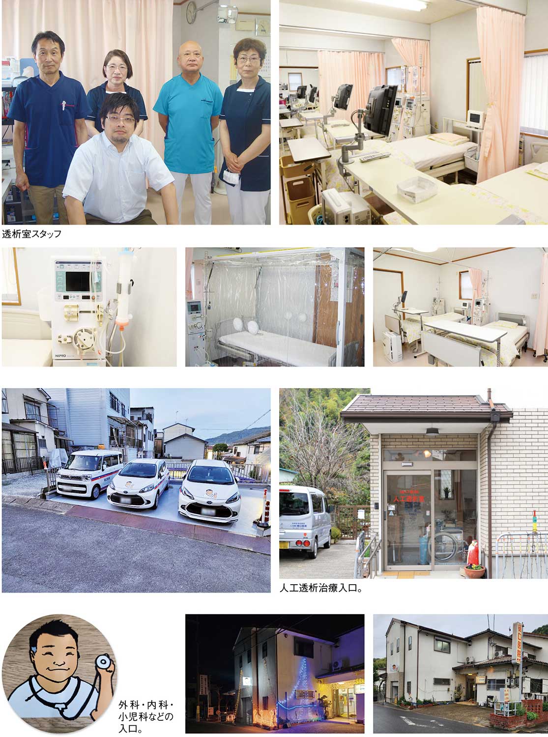 同院では、外科(一般外科、消化器外科、移植外科)や内科(一般内科、循環器内科、消化器内科、腎臓内科)小児科、整形外科、放射線科、泌尿器科、皮膚科、血液透析を標ぼうし、訪問診療や健康相談、予防接種にも対応。日本外科学会認定医や日本外科学会専門医、日本透析医学会専門医、日本医師会認定健康スポーツ医、日本医師会認定産業医、臨床腎移植学会腎移植専門医、在宅医療認定医など豊富な知見と資格を持つ院長を中心に、7名の医療スタッフが高齢者から子どもまで幅広い世代の患者さんの健康の悩みに応えている。日本透析医学会専門医として人工透析治療にも力を入れており、2021年には、人工透析施設を新設。小規模ながら最新の機器を揃え、より専門性の高い透析治療の提供が可能となった。透析治療とは、糖尿病や高血圧、慢性腎炎、加齢などの影響で、腎臓の機能が著しく低下した際に行われる治療の一つ。腎臓は、血液中に流れる老廃物や余分な水分をろ過して血液中をきれいに保ち、体内の水分量やナトリウム、カリウムなどのバランスを調整している。また、血圧を調整するホルモンや赤血球を作るのを助けるホルモンを分泌するなど生命に欠かせない役割も果たしている。腎臓病が進行し、腎臓の働きが正常時の10~15%以下まで低下すると、体内の老廃物や水分が十分に処理できなくなり、生命を維持することが難しくなるため、人工透析や腎移植が必要となる。