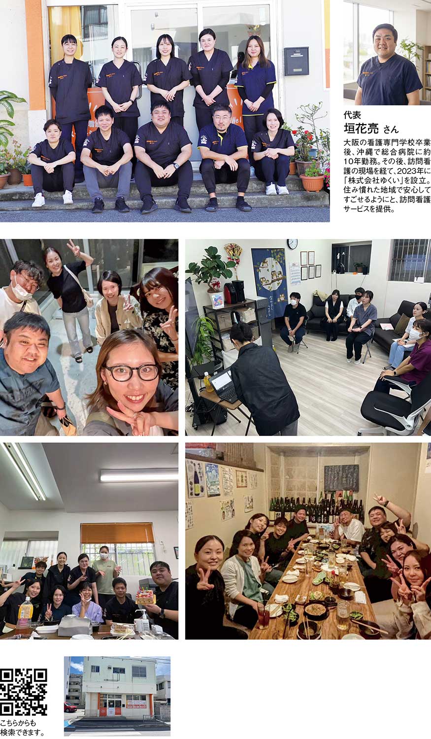 代表を務める垣花亮さんは、「幼い頃よく面倒を見てもらっていた祖父母のためになる仕事がしたい」と考え、看護師を志した。大阪の看護専門学校へ進学後、卒業と同時に地元・沖縄へ戻り、整形外科・形成外科、コロナ病棟、消化器外科・内科病棟で約10年にわたり勤務。現場で経験を重ねるなかで、次第に訪問看護の分野に携わるようになる。制度や時間に縛られた看護ではなく、もっと利用者やその家族に寄り添った看護を届けたいという想いが強まり、独立を決意。「職員一人ひとりを大切にすれば、質の高いサービスにつながり、良い循環が生まれる」「職員が安心して長く働ける会社を作りたい」という信念のもと、2023年6月に運営元となる「株式会社ゆくい」を設立。同年10月に『訪問看護ステーションゆくい』を開設した。