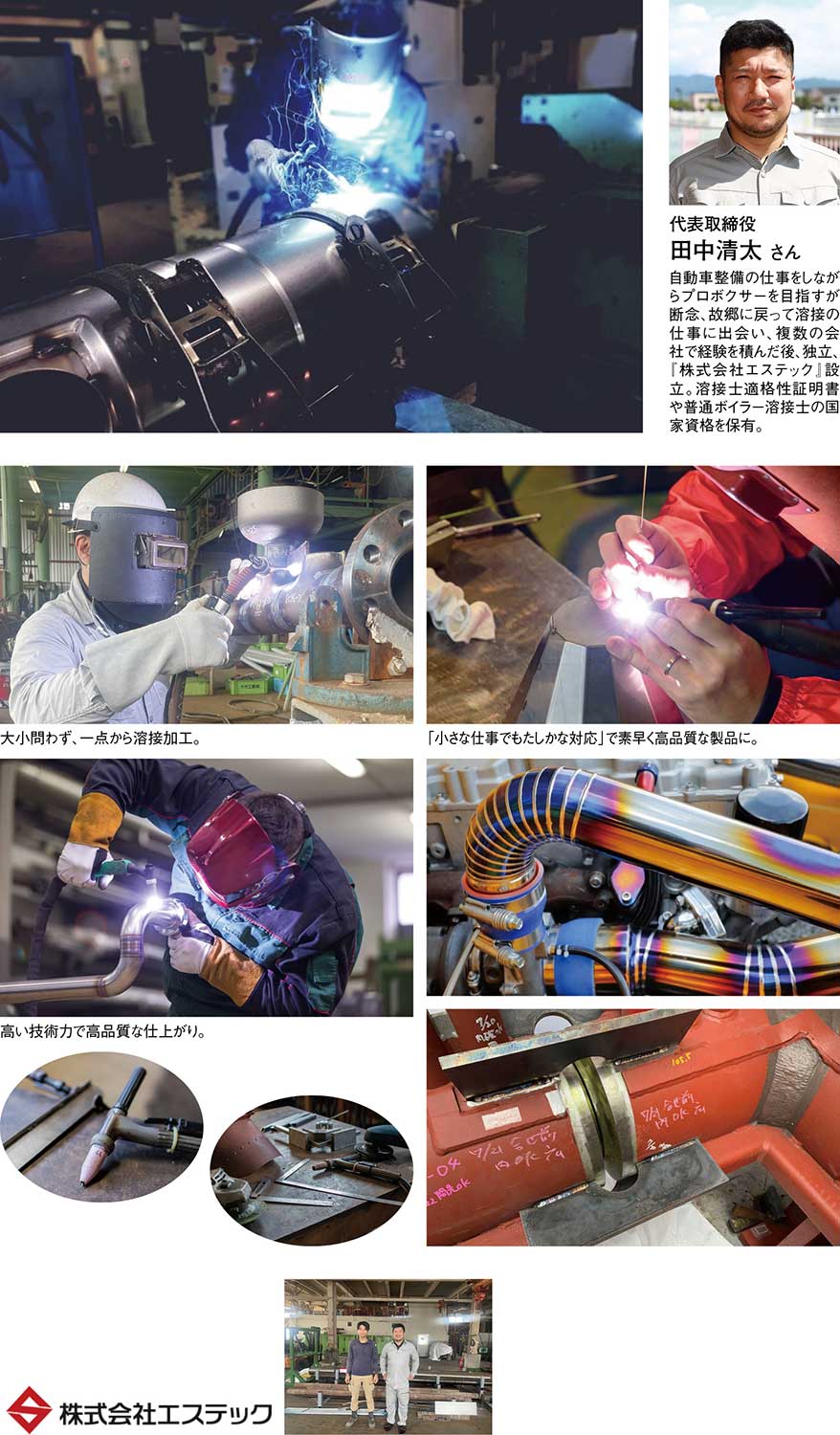 高い技術力と経験で代表取締役の田中清太さんは、「小さな仕事でも確かな対応」をモットーに、スピード感を持った対応力と徹底した品質チェック体制による高精度かつハイクオリティな溶接を提供。量産品から一点物のオーダー加工まで、規模を問わず柔軟に対応する姿勢も、多くの取引先から厚い信頼を集めている。
