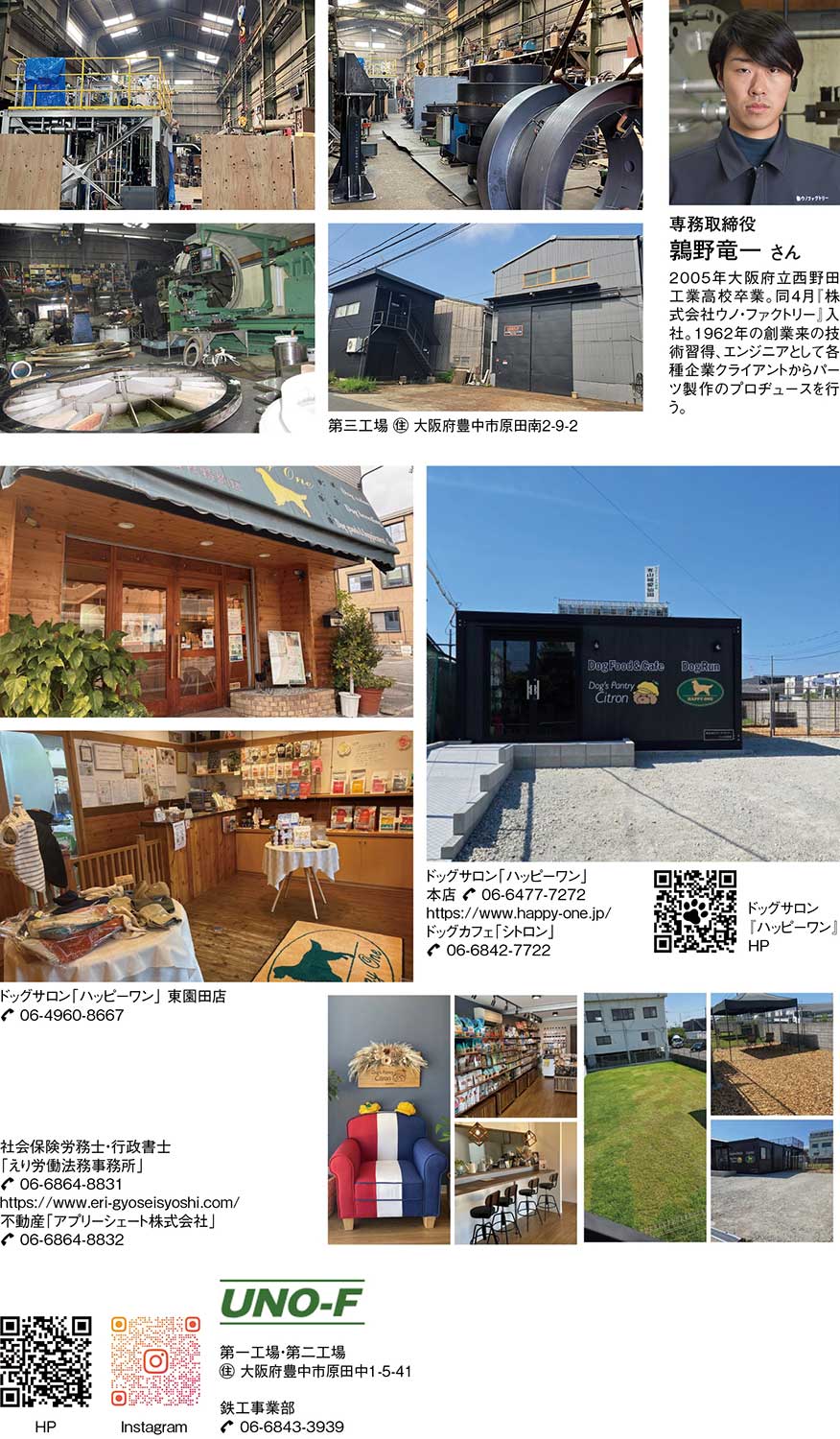 熟練の技術力と人への寄り添いを両輪として、異なる領域で価値を創造する『ウノ・ファクトリー』。大型旋盤加工で産業の根幹を支え、ペット事業で暮らしに彩りを添え、法務・労務支援で事業者の未来を支える。社員一人ひとりの専門性と柔軟な発想が、多様なニーズに応える力となり、技術と愛情、それぞれのフィールドで確かな存在感を放っている。