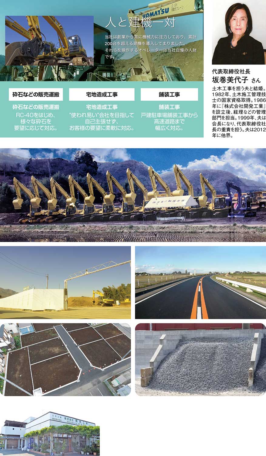 神奈川県厚木市の『株式会社開発工業』は、宅地造成工事を主軸に道路舗装工事や砕石・材料販売などの土木事業を手がけている土木工事のプロフェッショナル集団だ。同社の礎を築いたのは、重機への深いこだわりを持ち、オペレーターとブルドーザーや油圧ショベル、ローラーなどの建機をセットで派遣する「人・建機一対派遣体制」を作り上げた先代の故・坂巻会長。常に状況が変化する現場のニーズに合わせて派遣できるよう、建機を50台以上保有しており、自社で整備できる体制も整えている。
