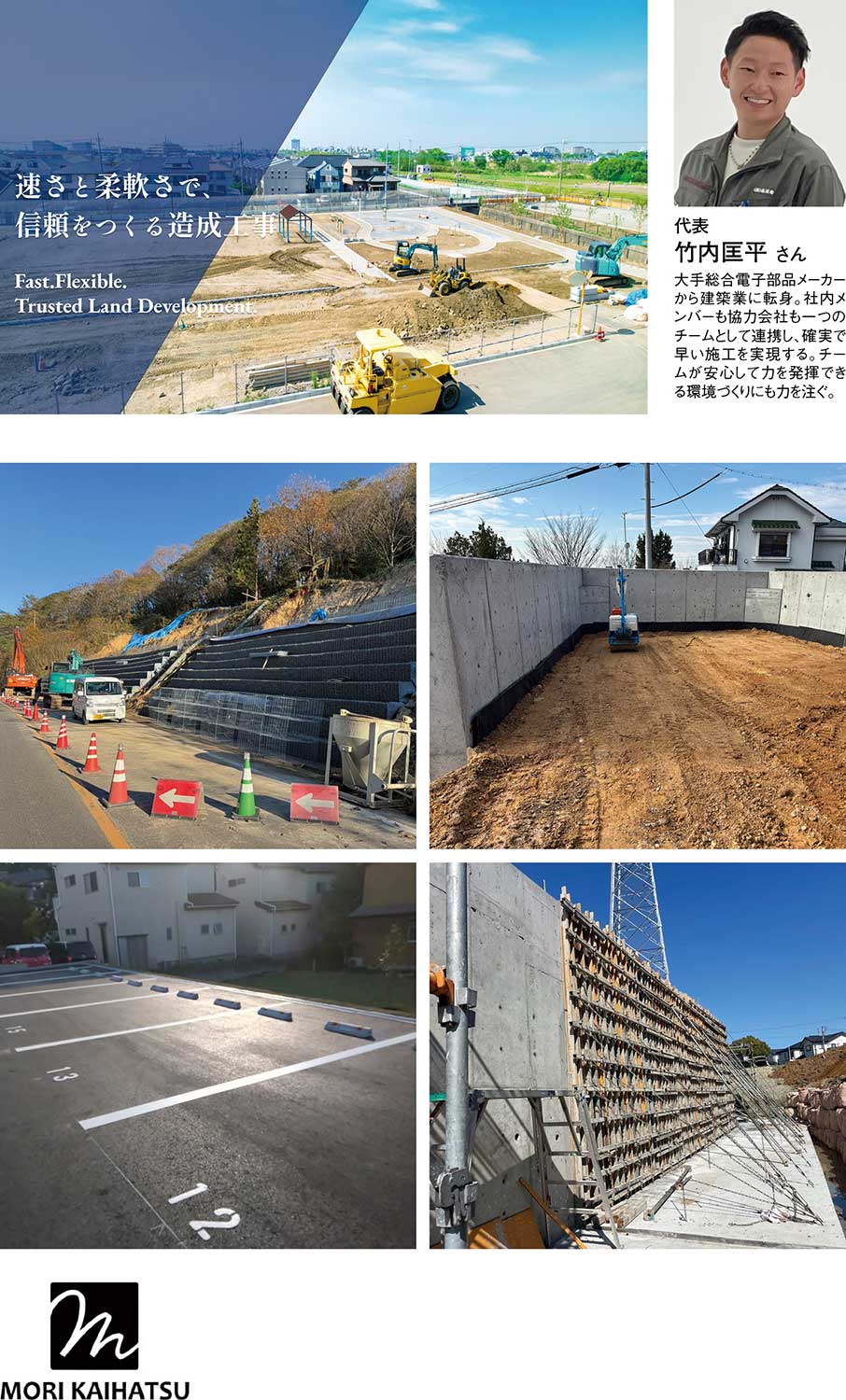 1992年に創業した『株式会社森開発』は、「信頼される仕事」「スピードある対応」「柔軟な現場力」を大切に、宅地造成を中心とする土木工事全般を手がけてきた土木工事のプロだ。代表取締役の竹内匡平さんは、大手総合電子部品メーカーに就職していたが、建設業を営む親族からの誘いをきっかけに土木の世界へ飛び込んだ。現場ではそれまでの知識も経験も通用せず何度も挫折を味わったが、その悔しさが負けず嫌いの性格に火をつけた。現場作業と営業の双方に奔走しながら、わずか4年で代表に就任。現在も『石原組』に籍を残しつつ、後継者不在だった『森開発』を引き継ぎ、自身で開拓した顧客を中心に事業を展開している。