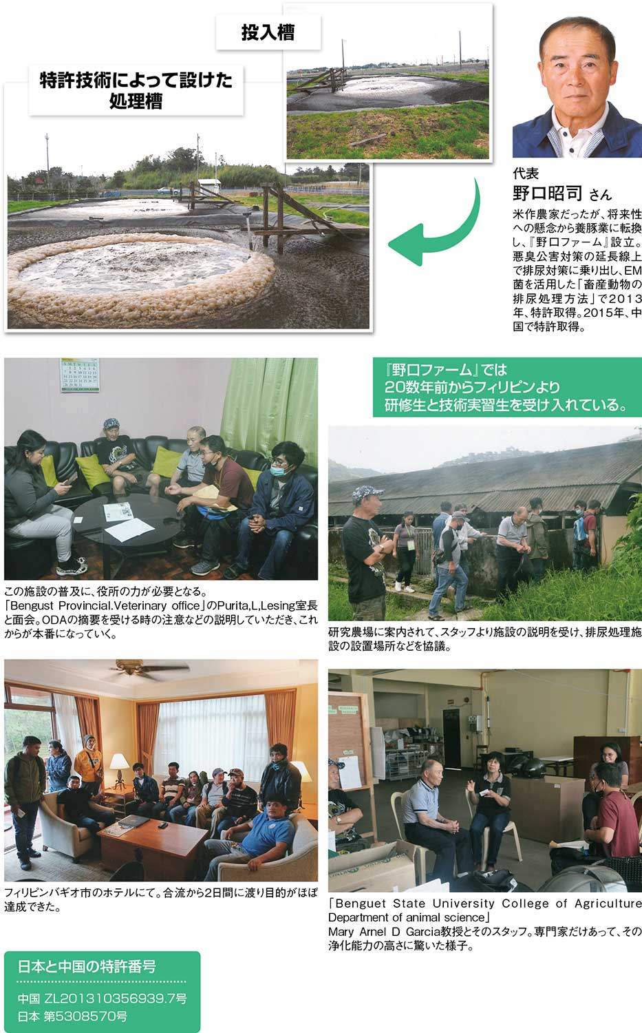 畜産業が抱える大きな課題の一つが、糞尿処理と悪臭対策だ。特に養豚場では、排泄物の処理方法次第で周辺環境への影響や地域住民との関係性が大きく左右する。茨城県神栖市で養豚業を営む『野口ファーム』代表取締役の野口昭司さんは米や麦を栽培する農家の家庭に生まれ、20歳から家業に携わってきた。米農家から養豚業へと転換し、事業を拡大していくなかで、次第に深刻化していったのが、糞尿処理に伴う悪臭や環境負荷の問題だった。一般的な養豚場では、糞は堆肥として農地へ還元する一方、尿は敷地内の窪地などに浸透させて処理する方法が多く用いられてきた。しかしこの方法では、分解の過程で強い臭気が発生し、地下水汚染の懸念も否定できない。1999年の家畜排せつ物法の施行により、豚の糞尿の処理が難しくなったことを受けて、研究を進めていくなかで光合成細菌や乳酸菌、酵母など抗酸化物質を産生するEM菌(有用微生物群)に着目。EM菌を活用した独自の排尿処理システムを確立し、2013年に日本で、2015年には中国で特許を取得した。「畜産動物の排尿処理方法」は、ビニールシートを敷いた二層構造の処理槽を設け、排尿とEM菌を水中エジェクターポンプで攪拌させて尿の初期浄化とEM菌の増殖を進行させる仕組みだ。2段階に分けて浄化を進めて取り出された最終浄化尿は、従来と比べてBOD(生物化学的酸素要求量)は約16分の1、窒素含有量は約5分の1まで低減する。処理後の水は水質汚濁防止法の排水基準を大幅に下回り、河川への放流が可能。副産物として発生する泥状物も柔らかく、堆肥として再利用できる。さらに、ポリエチレン製の防水シートを敷いた土手に木製台と曝気用のエアーポンプ3台を設置する簡易型の浄化システムも開発。導入のハードルを大きく下げたことで、国内外への普及が進んでいる。また、20年以上にわたって、海外から研修生や技術実習生を受け入れ、畜産動物の排泄物処理技術の国際普及にも積極的に取り組んできた。「健康な豚に育てるには、清潔な環境で飼うことが重要だ」という考えのもと、臭気対策や環境配慮といった課題の真正面に向き合い続けてきた姿勢が高く評価され、2025年には「世界畜産環境平和功労賞」を受賞した。現場の課題から解決策を生み出してきた野口さんの積み重ねが、これからの畜産業が進むべき道筋となっていくことだろう。