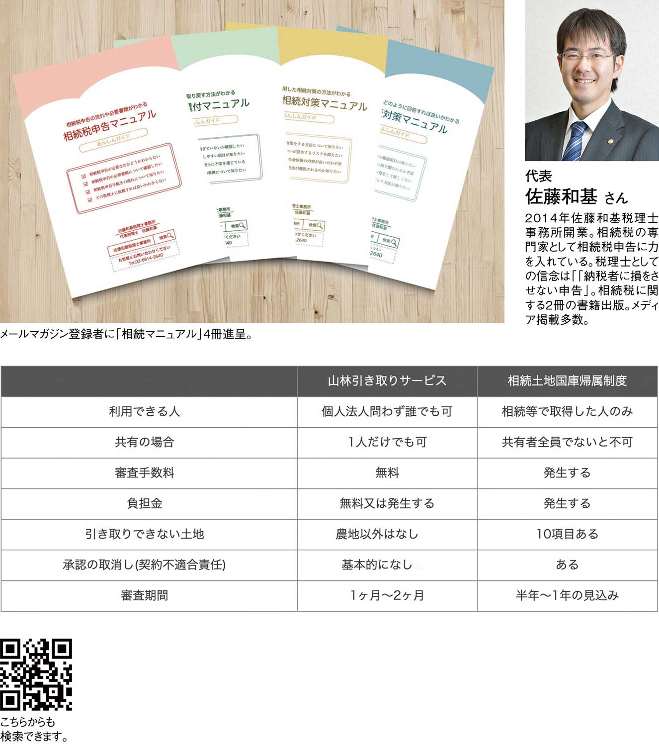 代表の佐藤和基さんは、相続税だけでなく、不動産や山林の扱いに関する相談にも力を入れている。「山林引き取りサービス」は、山林などを専門に扱う不動産会社などと提携して、不要な不動産を引き取るサービス。本サービスは、契約上「契約不適合責任を負わない」形を採用しており、引き取り後に管理責任やトラブルが発生する心配はない。さらに、引き取り費用の支払いは所有権移転登記が完了した後となるため、先払いの不安がなく、完全に手離れできる点が大きな特長だ。見積りは無料で、費用や流れを事前に確認できるのも安心材料の一つ。令和元年7月のサービス開始以降、令和7年12月31日までの申込件数は626件、成約186件、現在も16件が契約手続き中と豊富な実績を重ねている。相続で悩みがちな山林問題を確かな経験に基づき解決へ導くサービスだ。