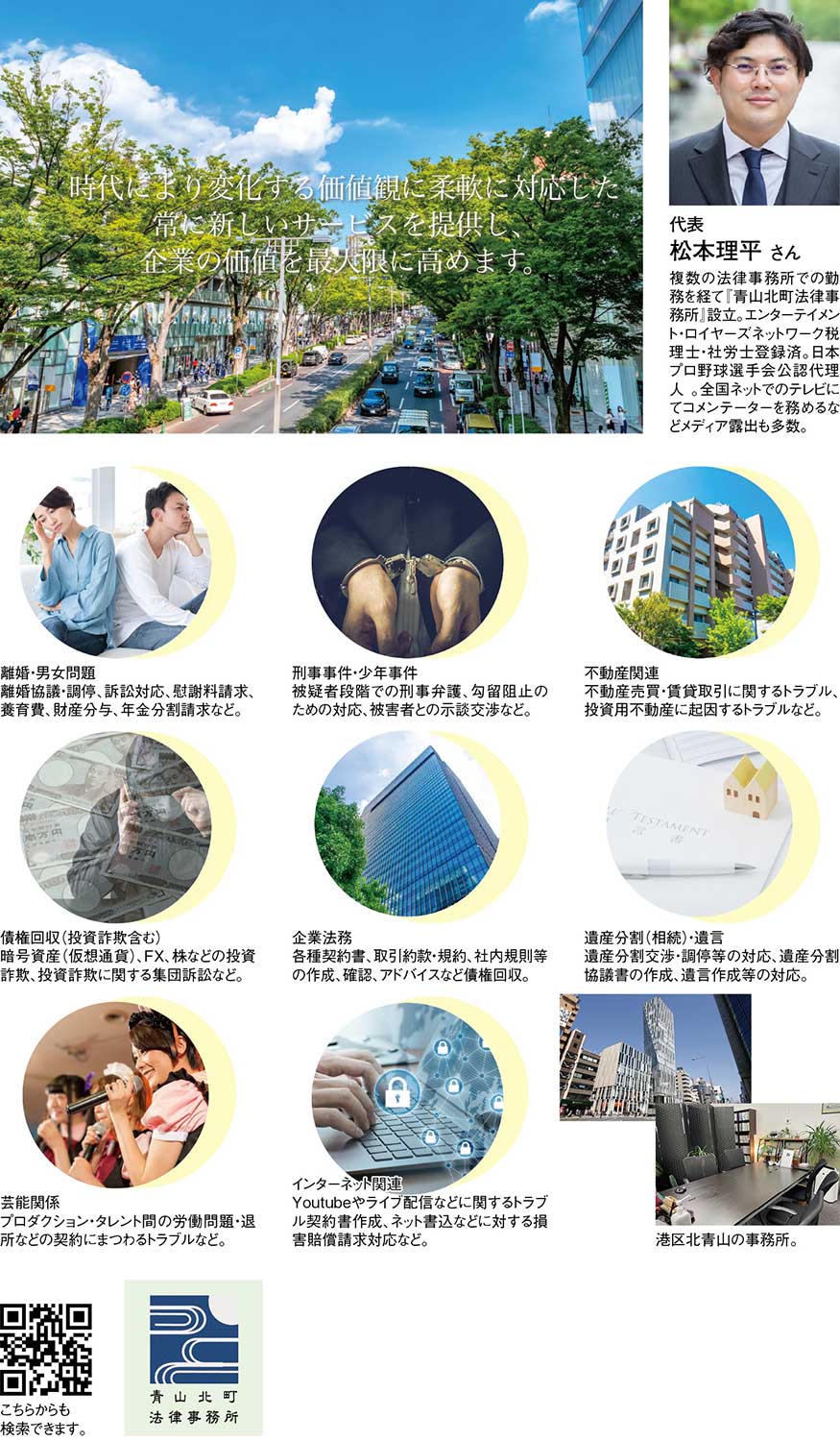 東京・表参道駅から徒歩圏内に位置する『青山北町法律事務所』は、企業法務から個人の法律問題まで幅広く対応する地域に根差した法律事務所。遺産分割交渉や調停、遺言書作成、不動産の売買・賃貸借、投資用不動産を巡るトラブルをはじめ、芸能・エンターテインメント分野、近年相談が急増しているYouTubeやライブ配信などインターネット関連の問題まで、多岐にわたる分野で実績を重ねている。代表を務める松本理平さんは、第一東京弁護士会所属。都内複数の法律事務所での勤務経験に加え、大手金融機関への出向経験を持ち、その知見を生かして『青山北町法律事務所』を設立。金融、不動産、企業活動に精通した視点は、複雑化する現代の法律問題において大きな強みとなっている。