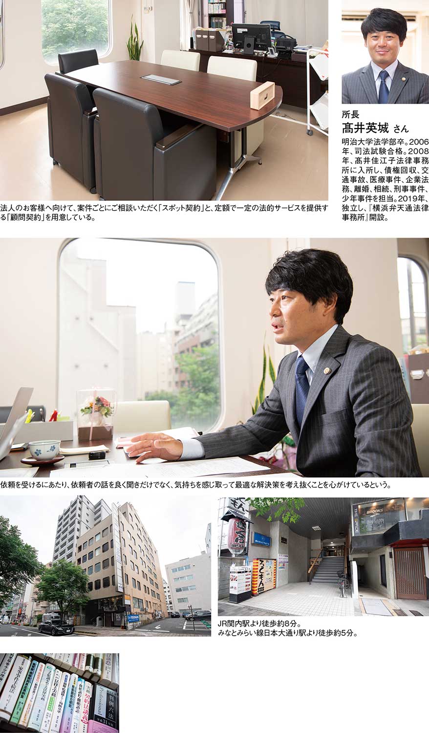 神奈川県横浜市・関内エリアに拠点を置く『横浜弁天通法律事務所』は、地域に密着しながら、多岐にわたる法的課題に対応する法律事務所。相談者一人ひとりの立場や事情に寄り添い、最善の解決へと導く姿勢を徹底し、弁護士が単独で対応するのではなく、複数の弁護士によるチームで対応。複数の弁護士による多角的多面的な考察、知識経験を活かした分析で、最適解を提案する体制を整えている。取り扱う分野は、交通事故や離婚・男女トラブル、遺産相続といった個人向けの相談から、企業法務や医療法務、債権回収、顧問契約まで幅広い。日常生活で誰もが直面し得るトラブルから、事業者が抱える法的な課題まで、ワンストップでサポート。相談者が専門用語や制度に不慣れでも安心して相談できるよう、丁寧に背景や手続きの意味を伝えつつ、選択肢とリスクを整理していくことを大切にしている。所長の高井英城さんは、交通事故や離婚問題、相続といった個人事件をメインに幅広い分野で実績を積んでいる
