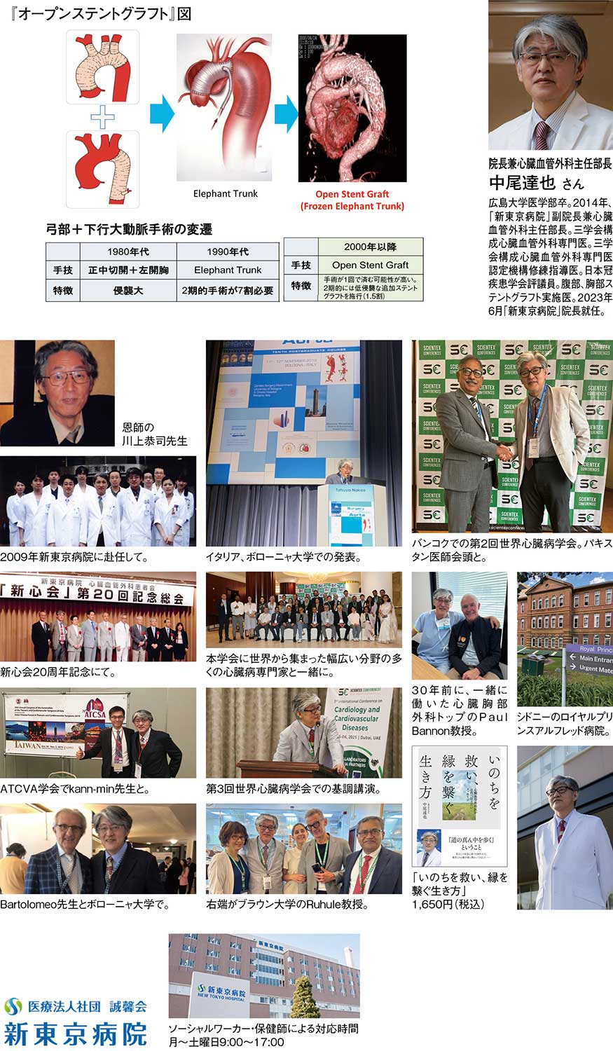 『新東京病院』院長の中尾達也さんは、心臓血管外科主任部長として、長年にわたり第一線で心臓・大血管手術に携わってきたスペシャリストだ。開心術や大動脈手術など心臓・大血管の高度な手術を数多く手がけ、ステントグラフトを用いた低侵襲治療の普及にも尽力してきた。開胸・開腹を伴う大動脈腫瘍の手術から、カテーテルを用いた低侵襲治療まで、幅広い術式を扱っており、患者さん一人ひとりの状態やリスクに応じて、最適な治療法を提供している。