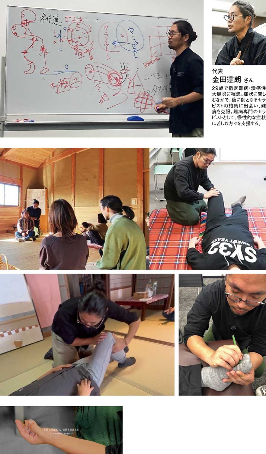 五感それぞれが発する情報と周波数に着目し、触覚を基本にしたアプローチで周波数の乱れを整える『五感周波操術』を行う金田達朗さん。金田さんは、引きこもりになるほどの重度のアトピー皮膚炎に苦しみ、29歳で潰瘍性大腸炎を患った。通院を続けてもなかなか改善が見られない中で、一人のセラピストの施術が人生を変えた。施術後に体調の変化を感じ、「この技術を学びたい」と務めていた会社を退職し、弟子入りした。慢性的な身体の不調の原因には周波数の乱れが関係していることもあると耳にした金田さんだったが、丸2年修業してもその言葉を理解できなかったという。それでも日々の修業を重ねるなかで、師匠や兄弟子が実践していた施術法や治療師たちとの交流を基に、施術法の根底に流れる理論を掘り下げ、理論を理解した。