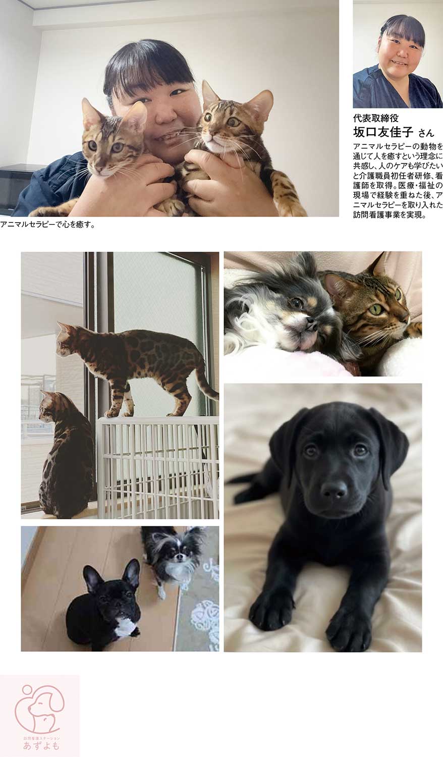 大阪市の『訪問看護ステーションあずよも』では、動物とのふれあいを取り入れた訪問看護サービスを提供している。代表取締役を務める坂口友佳子さんは、幼い頃から犬が大好きで、動物に関わる仕事に就きたいと考えていた。学業修了後、香川県の動物園に勤務したの後、退職し、トリマーの専門学校に通い始め、アニマルセラピーに出会った。人を癒すために動物と関わるという概念に強く惹かれ、人のケアについての知識も深めたいと介護職員初任者研修や看護師の資格を取得。長年にわたり、医療・福祉の現場で実務経験を積み、アニマルセラピーを取り入れた訪問看護ステーションを立ち上げるという構想を温めてきた。2025年7月、長年の夢を叶える形でアニマルセラピーを取り入れた『訪問看護ステーションあずよも』を開設。坂口さんが勤務していた介護施設の代表から事業譲渡の申し出を受け、既存の利用者やスタッフを引き継ぐかたちでスタートを切った。以来、動物のふれあいを取り入れたこれまでにない訪問看護を展開。入院や施設への入居でペットのお世話が難しくなってしまった方のためのペットシッターとして支援も行っている。