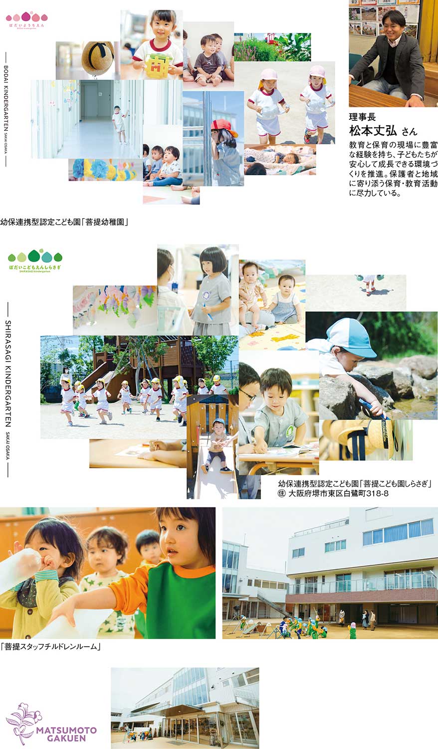 『学校法人松本学園』は、堺市東区を拠点に幼児教育・保育事業を展開する教育法人。幼保連携型認定こども園として「菩提幼稚園」や「菩提こども園しらさぎ」を運営し、地域の子育て家庭を総合的に支えている。また、保育ニーズに合わせて企業主導型保育所「菩提スタッフチルドレンルーム」も開設し、幅広い保護者の就労形態に対応した預かりの場を提供している。
