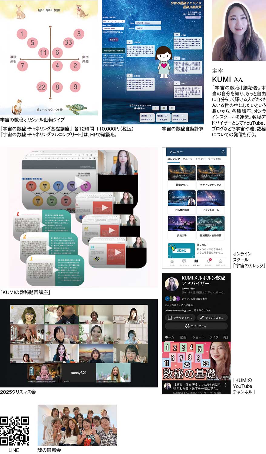 古代ギリシャの数学者ピタゴラスを起源とし、数を通して人の本質や人生の流れを読み解く数秘術。近年では「当たる占い」という枠を超え、、数字からその人の才能、個性、魂が求めるもの、強み、弱み、他者から見られる人物像、未来の方向性などを読み取り、より本来の自分で魂に沿った生き方ができる「自分自身を探求するツール」として注目を集めている。その中でも、誕生日と名前から導き出される数字をもとに、才能や個性、魂が本当に望んでいる生き方、人生のテーマや課題を立体的に読み解くのが『宇宙の数秘』。宇宙意識、前世、輪廻転生といったスピリチュアルな概念を感覚論で終わらせず、誰もが理解し、実生活に落とし込める形へと整理してきた専門家、メルボルン数秘アドバイザーのKUMIさんが、編み出した独自の自己解析法だ。KUMIさんが伝えているのは、「未来を当てる」数秘ではない。数字を通して本質の自分を知り、それを受け入れ、活かしながら生きていくための指針である。講座では、「宇宙の数秘」を通して、自分の性質や思考の癖、人との関わり方を俯瞰し、感情に振り回されるのではなく、意識的に人生を選択していく視点を育てていく。特徴的なのは、「数秘術という枠を超えていく」と言う目覚めの体験が用意されている点だ。数字に縛られるのではなく、数字を理解した先で、より自由な自己認識へと向かっていく構成となっている。また、『宇宙の数秘』では、見えない世界を感覚だけで扱うのではなく、論理的に理解することも重視。自分を整えるワークを重ねながら、チャネリングを安全に、現実的に扱う力を養う講座も開講。認定講師資格取得までサポートしてもらえるので、新たなビジネスに繋げられることも。オススメは、数秘もチャネリングも、資格も実践も認定講師も全て完結する「フルコンプリートコース」。8ヵ月分のカレッジ利用無料権に、KUMIさんのの60分個別セッションも付いた、もっともお得でかつカレッジ最高峰のコースだ。KUMIさんは多忙な日常の隙間を縫って、YouTube配信やブログを通し、毎日に活かせる宇宙視点のメッセージを発信。生徒やファン思いな人柄も、多くの支持を集める理由の一つだ。さらに、チャネリングと数秘を融合させた新たな講座を開講。これまで3ヵ月だった講座は、2026年新たに長期コースとして開校したので、より深く、自分自身と向き合うプロセスをサポートしていく。