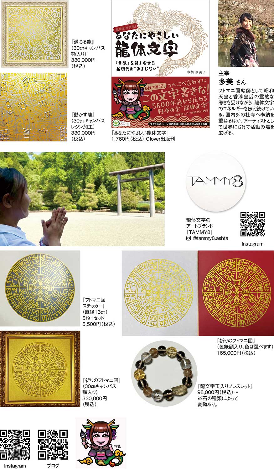 活動は国内にとどまらず、海外での神事や展示にも広がりを見せている。2025年にはオランダで神事をし、ロサンゼルスで『祈りのフトマニ図』のアートを発信、2026年10月にはルーヴル美術館のお膝元カルーセル・デュ・ルーヴルにて作品十五点を出展予定。重厚で神聖な「フトマニ図」に加え、風の時代を象徴する軽やかなアートも披露する計画だ。さらに、新たに立ち上げたアートブランド『TAMMY8(タミーアシュタ)』では、「龍体文字」を現代的なデザインへ昇華。アシュタはサンスクリット語で「8」を意味し、循環や調和を象徴する数字としてブランドの核となっている。