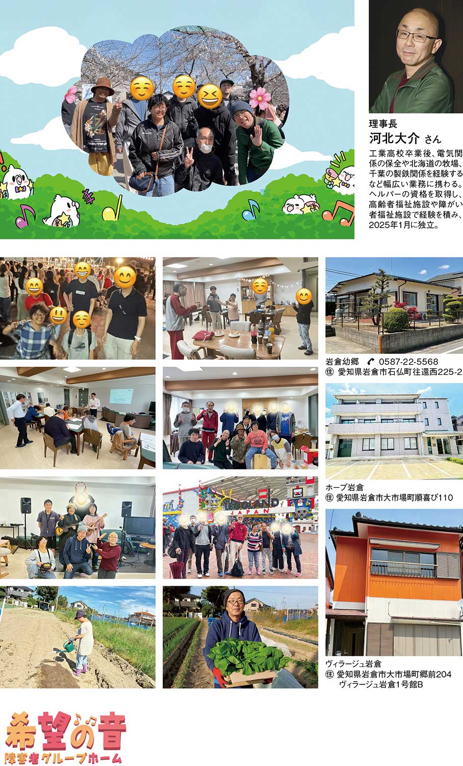 愛知県岩倉市に拠点を構える「NPO法人きみのいろ」は、障がいのある方が地域の一員として安心して暮らせる環境づくりを行っている。『障がい者グループホーム希望の音』を3棟運営し、誰もが自分らしく生きられる社会を目指したあたたかな支援を続けている。理事長を務める河北大介さんは、高齢者福祉施設で8年、障がい者福祉施設で5年にわたり現場経験を積んできたプロフェッショナル。支援する側・される側という関係ではなく、一人ひとりが社会の中で役割を持ち、自分らしく輝ける居場所をつくりたいという想いから、2022年にグループホーム『希望の音』をフランチャイズ契約でオープン。2025年には独立し、法人として本格的な運営をスタートさせた。現在、入居者は19名。家庭的な雰囲気の中で、それぞれのペースや個性を尊重しながら、入居者が自分らしく生活できるようスタッフが日々支援をしている。日々の暮らしを支えるだけでなく、月に一度のヨガ教室や入居者の趣味嗜好に合わせたセミナー、誕生日会などのイベントも積極的に開催。生活の中に楽しみや役割を持つことで、自然と笑顔が生まれる場となっている。