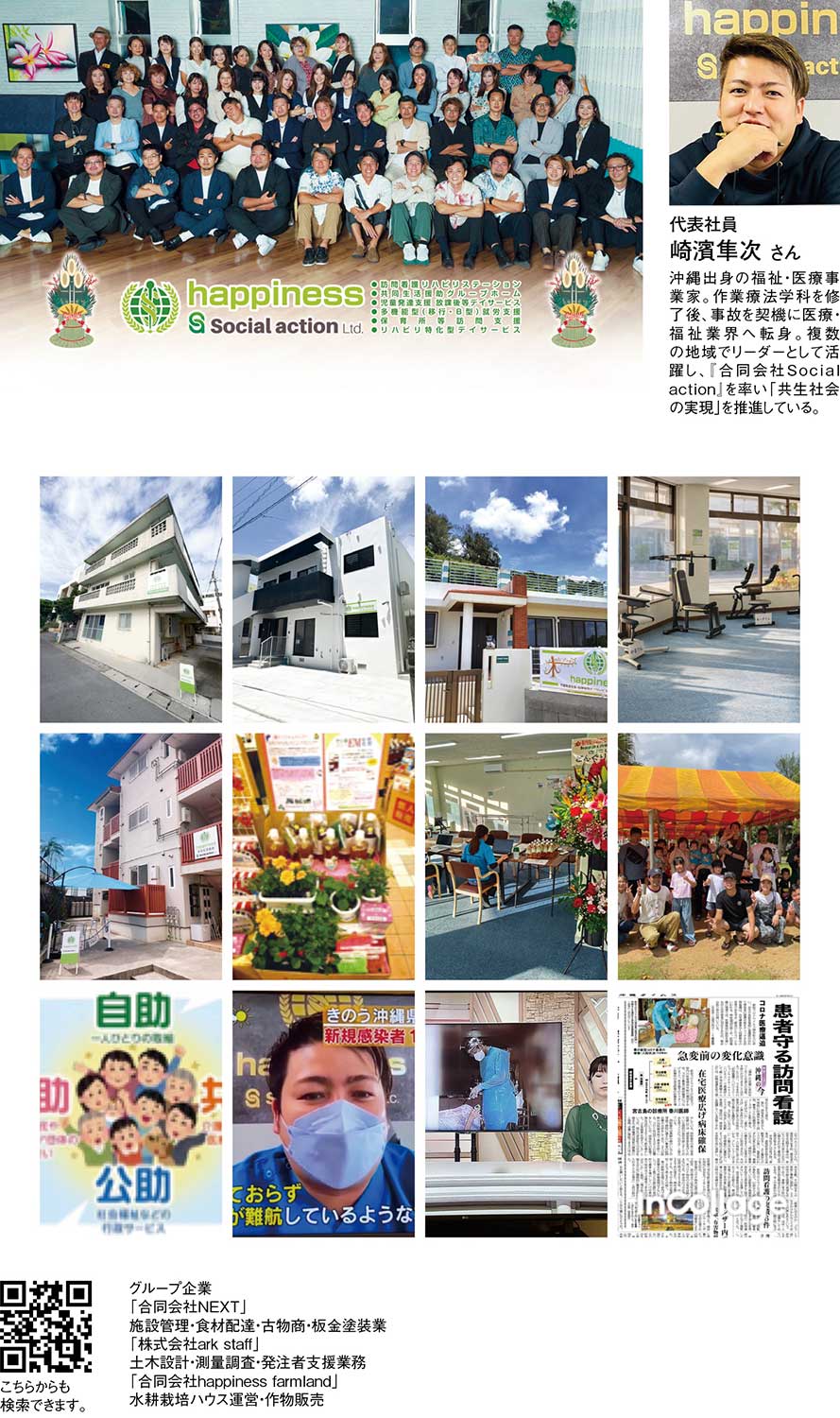 『合同会社Social action』は、利用者を第一に考えた利用者ファーストの福祉・医療支援を提供する沖縄の社会福祉事業者だ。企業理念として「多種多様な生き方・働き方をサポートする」「利用者ファーストの視点で行動する」「共生社会の実現を目指す」という基本方針を掲げ、代表社員の崎濱隼次さんは、利用者一人ひとりの暮らしと将来を支えるための多角的な支援を行っている。在宅で安心した生活を送るための「訪問看護リハビリステーション」を中心に、看護師や理学療法士、作業療法士、言語聴覚士といった専門スタッフがチームで連携しながら、利用者の身体的・生活上の課題に寄り添ったケアを提供。利用者の健康状態の観察や療養上の管理、個別のリハビリテーションなど、専門性の高い支援を通じて在宅生活の不安を軽減することを目指している。加えて、共同生活援助(グループホーム)では、障がいのある方が地域の中で安心して暮らせる生活環境を整え、日常生活に必要なサポートを行いながら自立を促進している。個室設備や共有スペースが整った住まいで、仲間と共に生活することで、生活リズムや社会性の向上を支援する。
