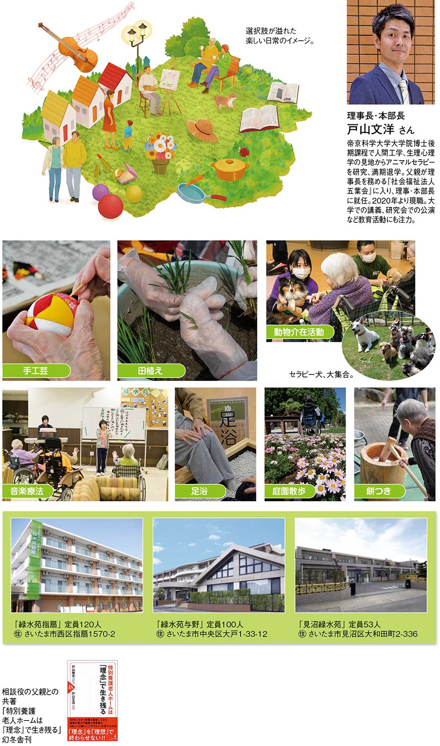 一方で、昨年度の介護報酬改定によって処遇改善加算制度が見直された点については、前向きな変化と捉えている。従来は介護職員のみが対象だったが、現在は生活相談員や看護師、ケアマネージャー、事務職員なども対象となった。『五葉会』では、専門的知識と技術を持った職員たちが在籍しており、要介護3以上の高齢者に対して入浴や排泄、食事などの日常生活支援や機能訓練、健康管理などを24時間体制で見守っている。また、「心を動かす時間」を大切にしており、音楽療法士による音楽療法や専門員によるアニマルセラピー、手工芸、書道、季節のイベントなど、日常に彩りを添える多彩な活動にも力を入れている。多職種が連携し、利用者一人ひとりの尊厳と生活の質を支えるケアを追求する『五葉会』にとって大きな支援となっており、現場全体の士気向上につながっているという。また、少子高齢化がますます進む今後の日本に必要なのは、介護に対する教育の普及だと戸山さんは語る。例えば、小学校では道徳や社会科の授業で介護の仕組みや倫理を学び、高校では介護技術に触れる機会を設けることで社会全体としての理解が深まっていくはずだ。介護教育を通して誰もがある程度できるようになっておき、家族の中で完結することが望ましい。そのうえで、それをより専門的に、質の高いかたちで行うのが介護の専門職であるべきだという。