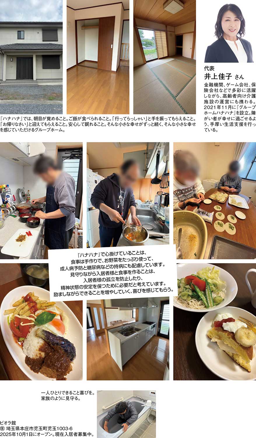 うつや双極性障害、統合失調症など、精神障がいをもつ方々が自分らしく、安心して暮らすための終の住処として、地域に根ざした支援を続けている『グループホームハナハナ』。代表を務める井上佳子さんは、介護福祉業界に長く携わり、老人介護施設も手がけていたが、障がいのある知人との出会いをきっかけに「障がいがあっても、最期まで自宅のような環境で安心して過ごせる場所をつくりたい」との想いで、2021年11月に障がい者向けグループホームを設立した。同施設の特長は、スタッフによる24時間体制の手厚い見守りと家庭的な雰囲気のなかで行われる生活支援だ。自分を制御することが苦手な傾向のある精神障がい者に対し、糖質を抑えた手作りメニューによる食事の支援やお小遣い制の導入、生活保護や障害年金の手続きや報告など、一人ひとりの特性や心身の状態に応じてきめ細かく対応している。「おはよう」「おやすみ」など決まった時間に声を掛け合い一緒に食卓を囲んだり、帰宅時の出迎えなど日常のやりとりを通じて小さな幸せを感じながら生活できるよう、丁寧に寄り添っている。精神疾患で長期入院をしていたケースでは、退院後すぐの社会復帰が難しいため、見守る場所が必要だ。しかし、うつやメンタル不調、双極性障害などの精神疾患はサポートが難しく、受け入れ先が限られているのが現状だ。こうした状況のなか、井上さんは少しでも多くの人を助けたいという思いで、2025年10月に2棟目を開設。ただの居場所ではなく家族のような温かさのなかで安心して暮らせる場所として、より多くの人を迎え入れる体制を整えた。この地域に根ざした実直な姿勢は、支援センターや行政関係者からも面倒見の良い施設として高く評価されている。障がいをもつ人々が最期まで安心して暮らせる場所を見つけることは容易ではない。医療と福祉の連携の難しさも大きな課題の一つだ。