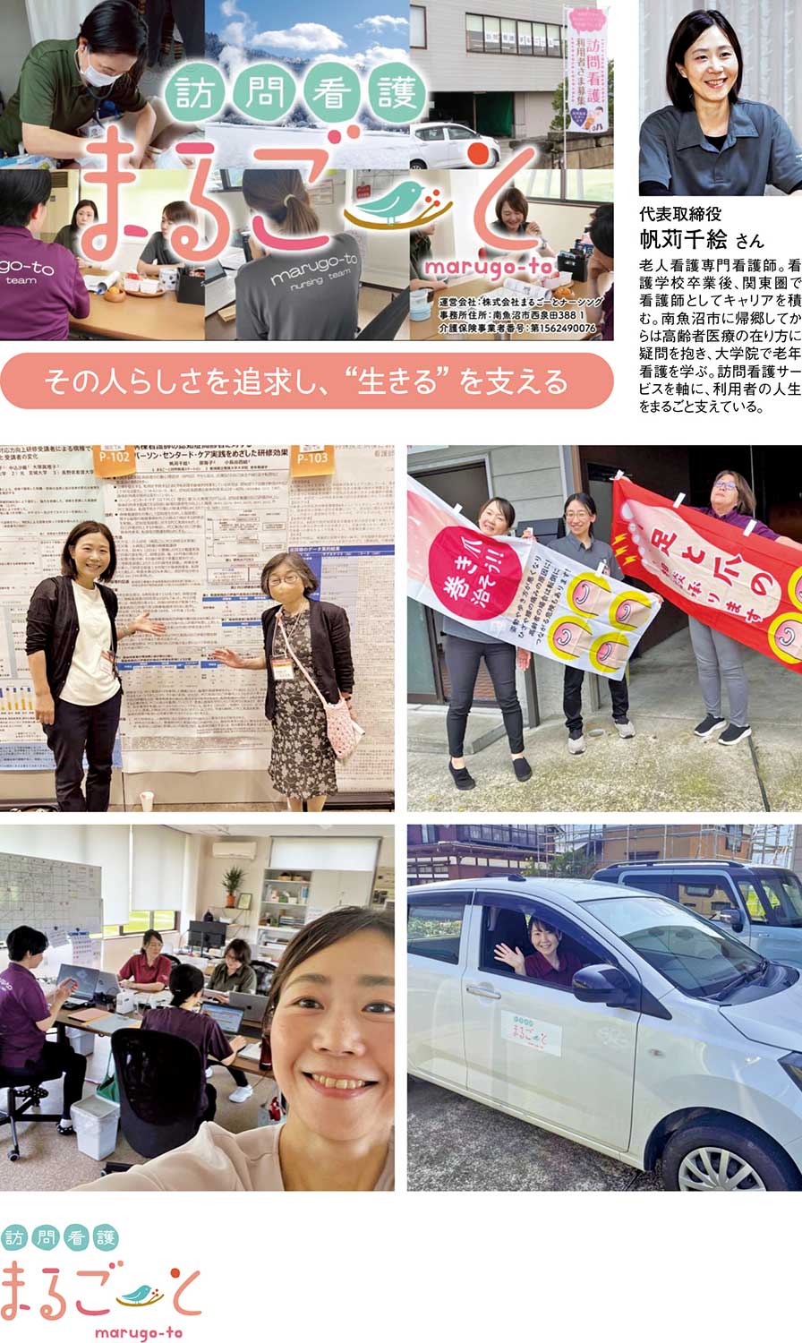 代表取締役で、老人看護専門看護師の帆苅千絵さんは、20年以上に亘って看護の現場に身を置いてきたベテラン看護師。健康な時も病気になっても「生きていて良かった」と感じられる時間を支えるため、寄り添うように現場へ赴いている。その根底にあるのは、誰もが死というゴールに向かうなかで「どう生き抜くかを支えたい」という真摯な思いだ。