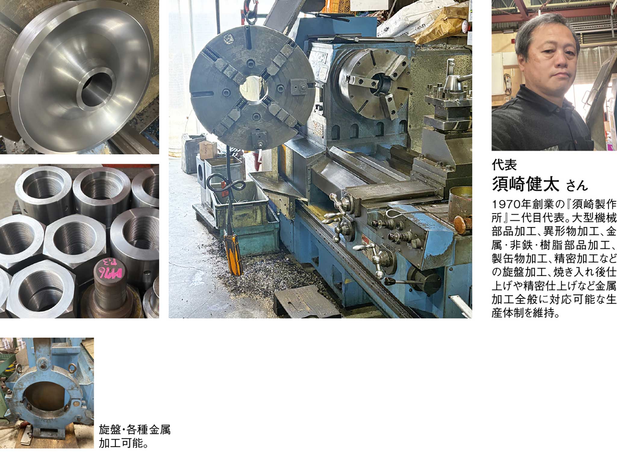 機械の回転や動きを支える円形部品を作るための旋盤加工。1970年に創業した『須崎製作所』は、産業機械や自動車、バイク、建設機械、医療機器などの産業機械部品を手掛け、日本のものづくりの現場を支えてきた町工場だ。2018年に二代目代表に就任した須崎健太さんは、中学生の頃から家業の旋盤加工を手伝う形で長年にわたって旋盤加工に向き合ってきた。熟練の職人技と先進設備を活かし、外径加工や内径加工、溝加工、ねじ切りなど形状や精度が求められる工程にも案件ごとに最適な方法を選択する。直径600~1000㎜クラスの大型加工にも対応し、多様なサイズ・形状に応えている。金属に限らず、非鉄金属や樹脂、異形物など素材や仕様の異なる加工にも対応。特注品や試作品、焼き入れ後の仕上げなど高度な技術を要する案件では、経験に裏打ちされた判断力で工程を組み立て、安定した品質を実現する。大量生産では応えきれない細かな要望にも丁寧に向き合い、最適な加工を見極めている。町工場ならではの強みを活かしながら、これからも日本のものづくりを支え続けていく。