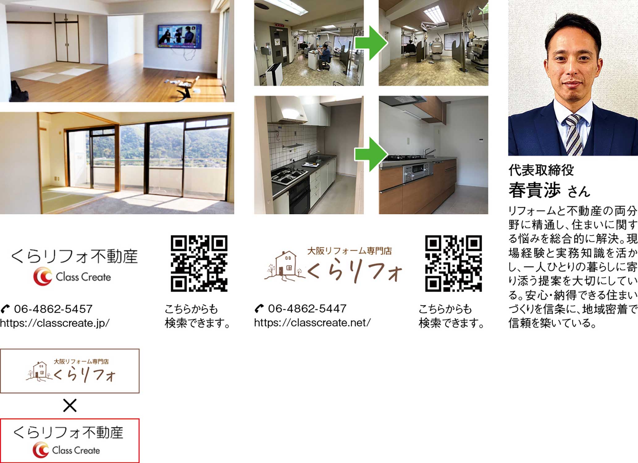 大阪市を拠点とする『クラスクリエート株式会社』は、リフォーム事業『くらリフォ』と不動産事業『くらリフォ不動産』を展開し、住まいのトータルサポートを行っている。『くらリフォ』は、内装リフォームからリノベーション、小さな修繕まで幅広く対応する自社施工のサービスで、大阪市・東淀川区・淀川区・吹田市を中心に地域密着で実績を積んでいる。中古住宅やマンションの購入からリフォームまでワンストップで相談できる特長もあり、物件探しとリフォーム相談を同時に進められる点が好評。『くらリフォ不動産』では、中古住宅購入・賃貸物件の提案からリフォーム・リノベーションまで一貫してサポートし、お客様の理想の住まいづくりを支えている。購入後のリノベーション時に仲介手数料が割引になるなどお得な選択肢も提供。スタッフはお客様のご要望を大切にし、生活スタイルや将来のことを見据えた最適な提案を心がけている。代表取締役の春貴渉さんも、「住まいづくりは人生の大きな選択。信頼できるパートナーとしてお客様を支えたい」という理念を大切に、スタッフ一同お客様一人ひとりと真摯に向き合う。リフォームも不動産も安心して任せられるサービスだ。