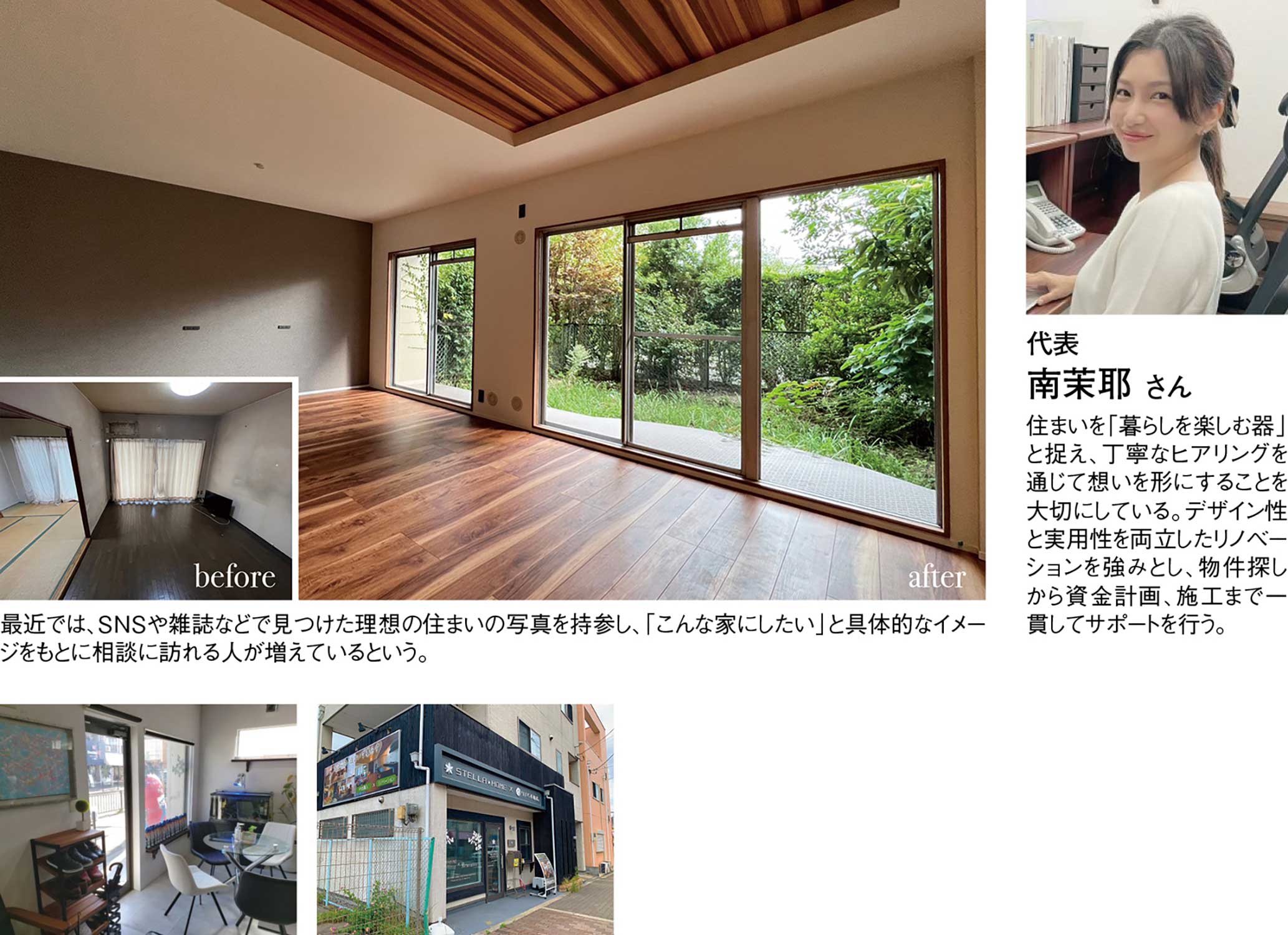 理想の住まいを求めて注文住宅を検討しても、予算や希望エリアの問題で条件に合う土地や物件が見つからないという声は少なくない。『ステラホーム』では、中古住宅を購入し、間取りから自由に設計するリノベーションによって、注文住宅のような住まいづくりを実現している。同社では、家の具体的なイメージを間取りや素材、設備計画に落とし込み、実際の住空間として具現化していくことを得意としている。代表の南茉耶さんは、打ち合わせを進める中で、帰宅後の荷物の置き場所や収納不足、家族の生活動線など、日常の中にある小さな不便やストレスも整理しながら、本当に暮らしやすい住まいへと整える提案を行う。特に玄関横の土間収納の新設や拡張、家族共有の収納スペースづくりなどは相談が多く、生活スタイルに合わせた間取り変更の提案につながっている。物件を購入してから「この間取りでは理想のリノベーションができない」と気づくケースも少なくない。そのため最近では、物件を決める前に相談し、リノベーションを前提とした物件選びを行う人も増えているという。設備や内装仕様、照明計画やスマート設備に精通したスタッフが直接対応するため、その場で具体的な仕様決定が進められる点も安心感につながっている。「家に帰るのが楽しみになる住まいを、一緒につくっていきたい」。そうした想いのもと、注文住宅の理想をより現実的な形で叶える住まいづくりとして、『ステラホーム』は注目されている。