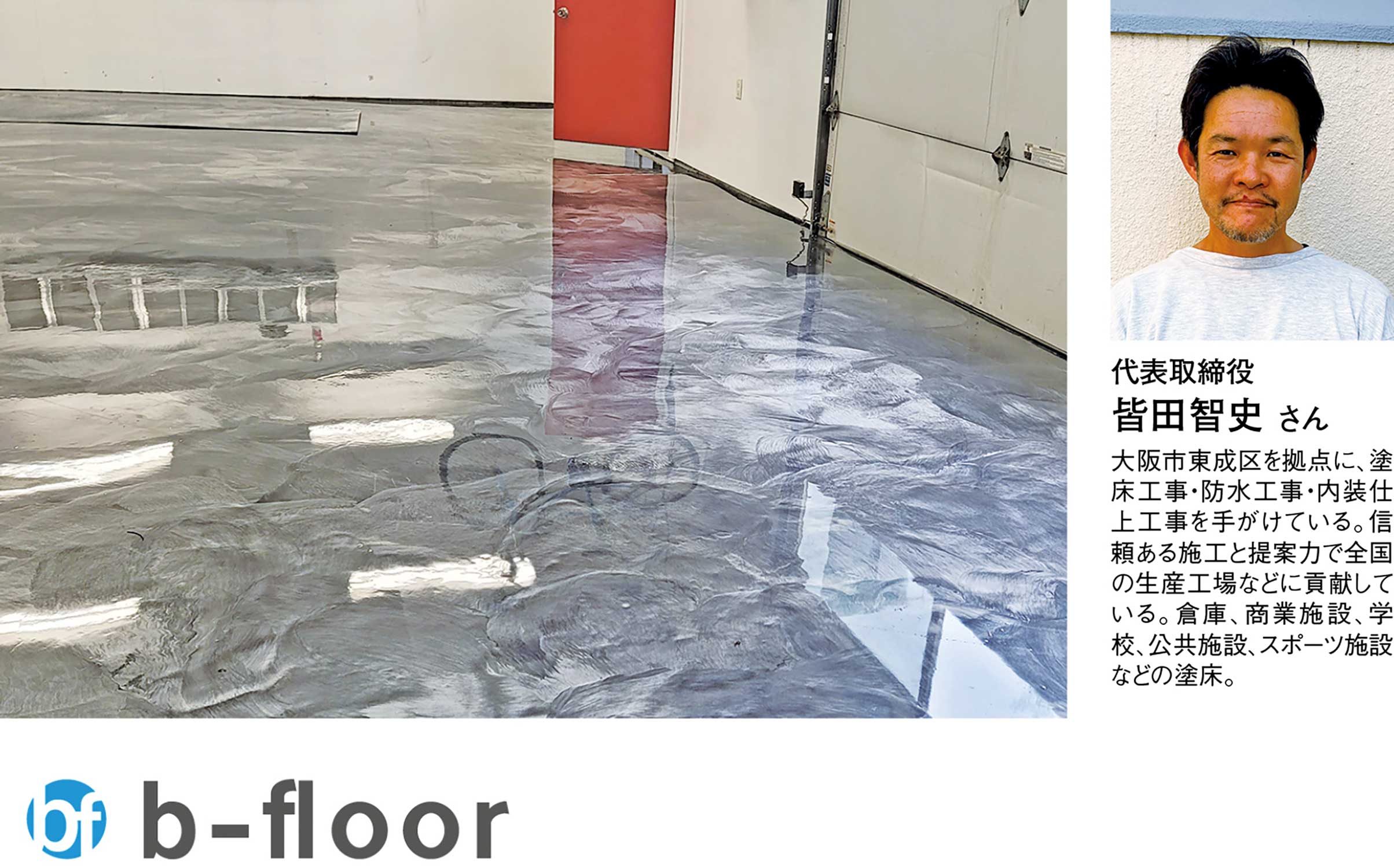 『株式会社ビーフロア』は、プールや工場など高い耐久性と安全性が求められる現場でエポキシ樹脂床施工を数多く手がけてきた床の専門企業。代表取締役である皆田智史さんのもと、これまで培ってきた確かな施工技術と素材知識を活かし、従来の塗装工事である「機能性重視の床施工」に加え、デザイン性に特化した新カテゴリ『フロアレジンアート』を展開している。