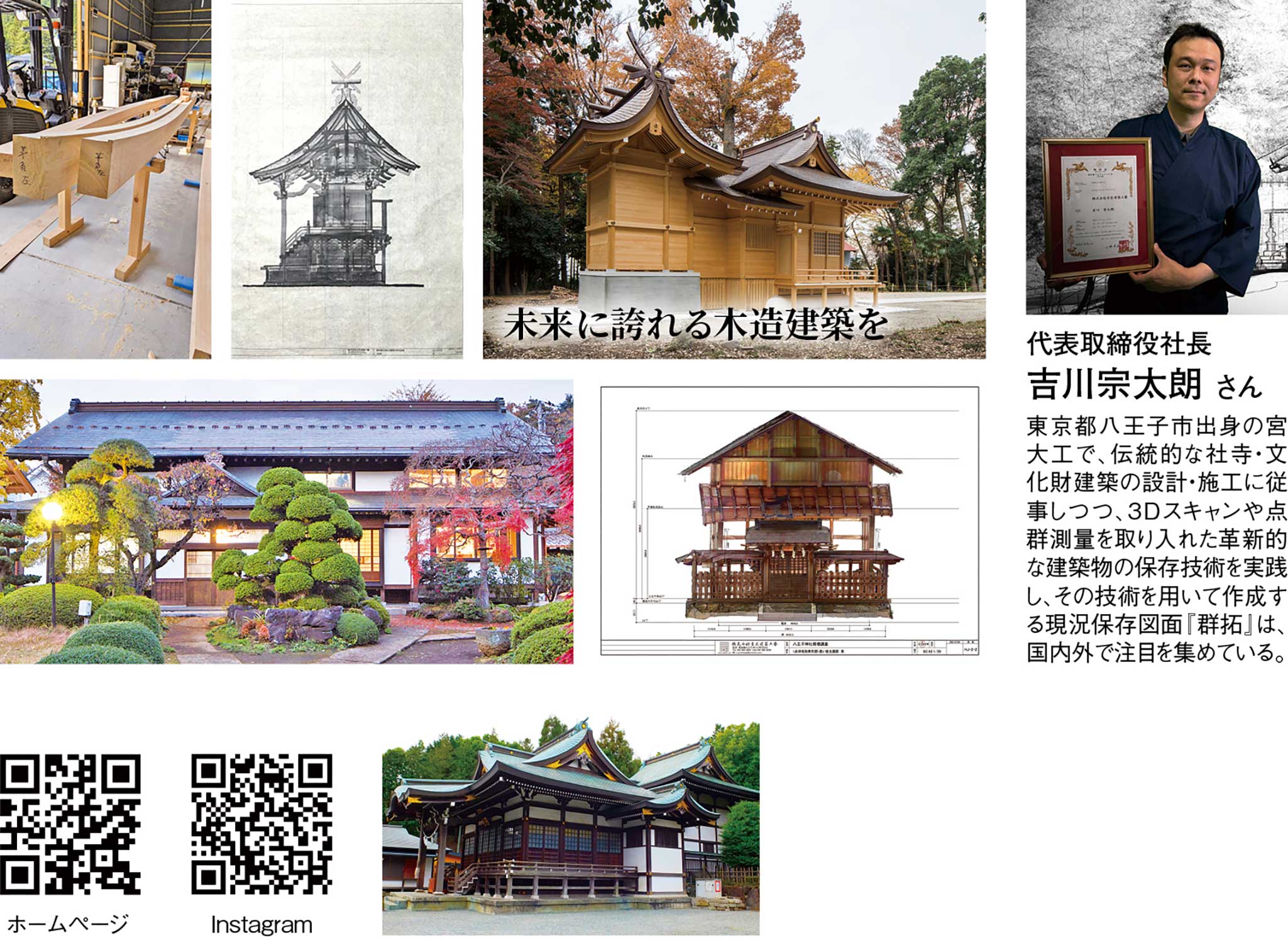 東京都八王子市で社寺建築や文化財修繕を手がける『株式会社吉匠建築工藝』が提案する『群拓』は、建物の「いま」を未来へ遺すための革新的な手段だ。3Dスキャン技術と宮大工の知識を駆使して建物を細部まで計測し、その点群データをもとに高精度の「現況保存図面」を作成して和紙に出力することで『群拓』は完成する。建物のわずかな傾きや梁の癖、長年の暮らしが生んだ擦れや曲線までも魚拓のように写し取り、確かなデータとして遺すことのできるこの技術により、将来の修繕や改修で迷いが出たとき、当時の姿を確かめられる拠り所が残るのは住まい手にとって大きな安心だ。万一建物そのものが失われても、特長や佇まいを追える可能性を手元に残せることにも価値がある。代表取締役社長の吉川宗太朗さんが「今の姿を遺すことが、次の手を助ける」と語るように、和紙のやわらかな質感は資料でありながら飾って眺めたくなる静かな美しさを湛え、数字だけでは届かない建物の温度や気配、家族の記憶までをそっと抱え込む。同社は『群拓』と『群拓現況保存図面』の商標を取得し、建物の「いま」を未来へつなぐ技術に名前を与えた。