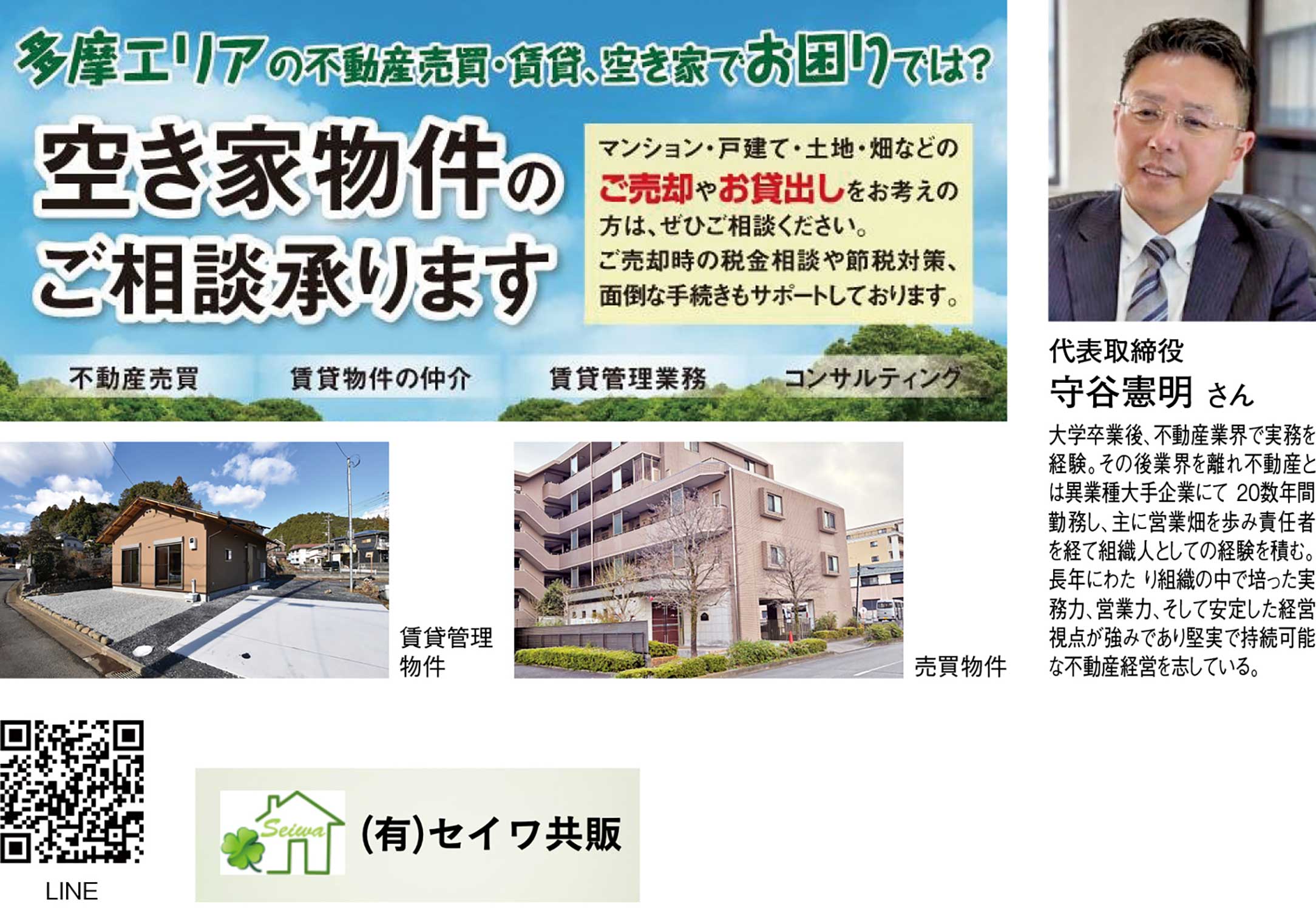 東京都青梅市を拠点に、多摩エリアの不動産を長年見つめ続けているのが『有限会社セイワ共販』。世帯に沿って寄り添う地域密着型でありながら確かな専門性を備えた不動産会社だ。売買・賃貸を軸に、戸建てやマンション、事業用物件、土地、駐車場まで幅広く扱い、個人から法人まで多様なニーズに対応。代表取締役の守谷憲明さんは、物件情報の表層だけで判断せず、立地特性、将来性、市場動向を踏まえた現実的な提案力に強みがあるという。公式サイトでは、「初期費用を抑えたい」「都内エリアへのアクセス重視」「シニア向け」など様々な希望に合わせて検索できるシステムも整っている。微細なこだわりも相談可能。住まい探しはもちろん、資産形成や相続、事業用不動産の活用など、判断が難しい局面においても経験に裏打ちされた視点で選択肢を整理。地域の相場や動きを熟知しているからこそ可能な無理のない価格設定とリスクを見据えた助言でも信頼を集める。また、空き家ビジネスにいち早く着目し、空き家の有効活用や売買をはじめ、老朽化を防ぐための管理業務を一貫して手掛けている。不動産を取引で終わらせず、その先の暮らしや事業の継続までを見据える姿勢が、選ばれ続けている理由だ。
