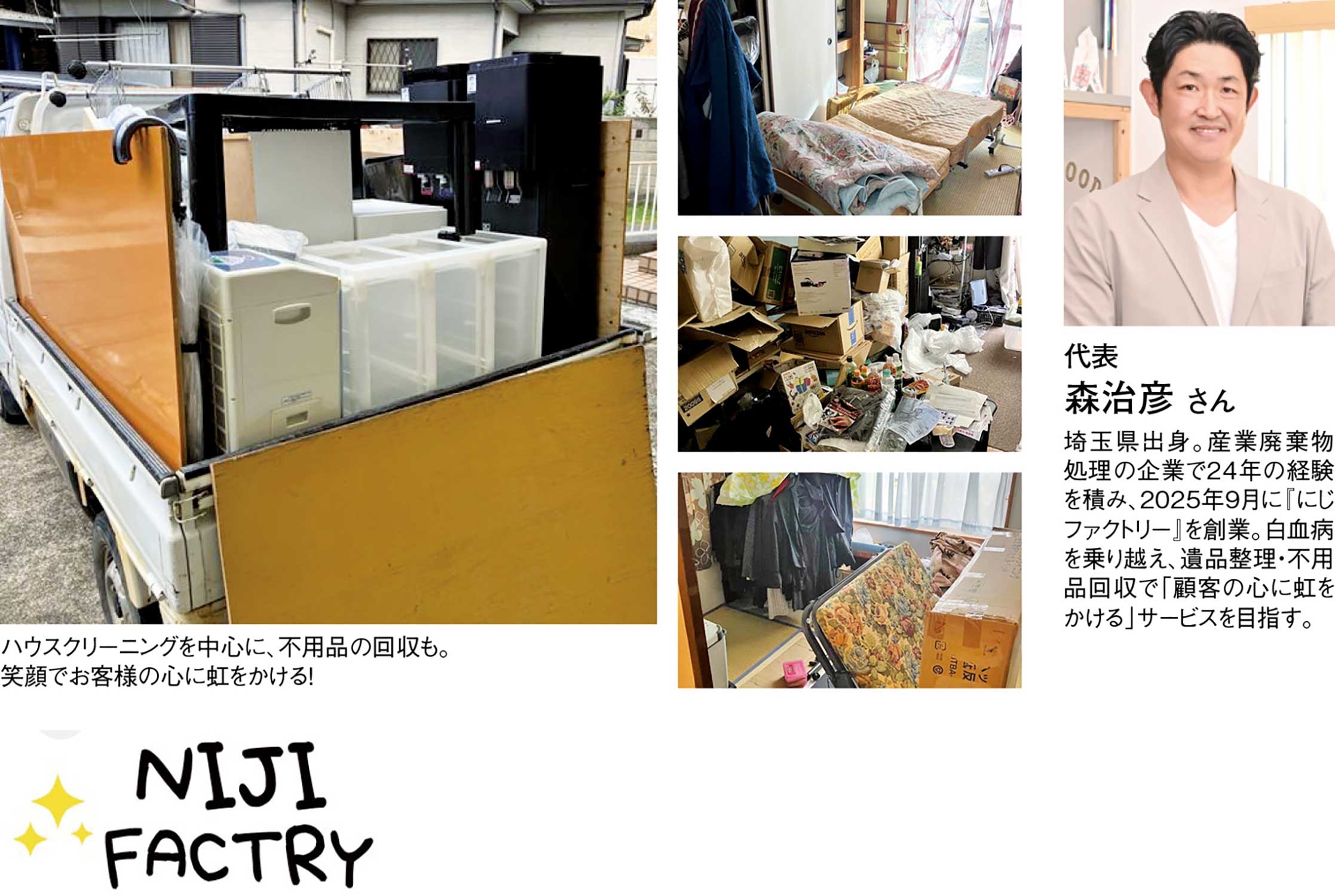 埼玉県深谷市を拠点に活動する『にじファクトリー』は、ハウスクリーニングをメインに、住まいを清潔で快適な空間へと整える片付け・清掃サービスを提供している。代表の森治彦さんは、産業廃棄物処理会社で長年にわたり現場経験を積んだ後、2025年9月に独立。白血病という大きな困難を乗り越えた経験から、「顧客の心に虹をかけたい」という想いを胸に、真心を込めた対応を大切にしている。キッチン・浴室・トイレ・換気扇・エアコンなど汚れが溜まりやすい箇所を中心に、プロならではの技術と専用機材で徹底洗浄。作業前には丁寧なヒアリングと状態確認を行い、住まいの状況や要望に合わせた最適なプランを提案する。安全性とスピード、そして仕上がりの美しさを両立した高品質なサービスが、多くの利用者から高く評価されている。