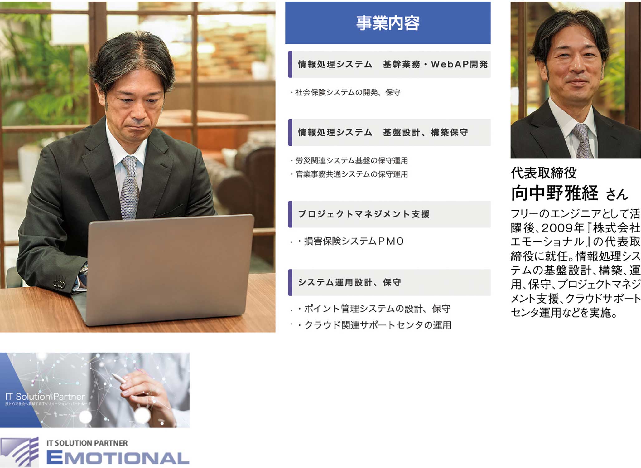 『株式会社エモーショナル』代表取締役の向中野雅経さんの一貫した信念だ。同社はITサービスの総合商社として、単なる作業請負ではなく、理念に基づく誠実な姿勢を重んじ、高品質なシステム開発と運用を提供している。情報処理システムの設計・構築・保守を軸に、官公庁向け業務や労災関連システムの運用支援、損保分野のPMO、クラウドサポートセンター運営など領域は幅広い。向中野さんが大切にするのは、要望を満たすだけで終わらせず、本質的に価値ある仕組みを見極めること。エンジニアの知見を生かした選択肢を提示し、顧客と共に考え抜く。また、対話を重ね、最良の答えへ導く積み重ねが技術力を形づくり、人と技術を育てる風土が社員の誇りと持続的成長を支えている。多様な現場で培った経験を共有し、学び合う文化が挑戦を後押しし、変化の時代に信頼されるパートナーとして進化を続けていくことで一人ひとりが主体性を持ち、誠実な判断で顧客と社会の期待に応え続ける。その積層が企業価値を高め、未来への責任を果たす。