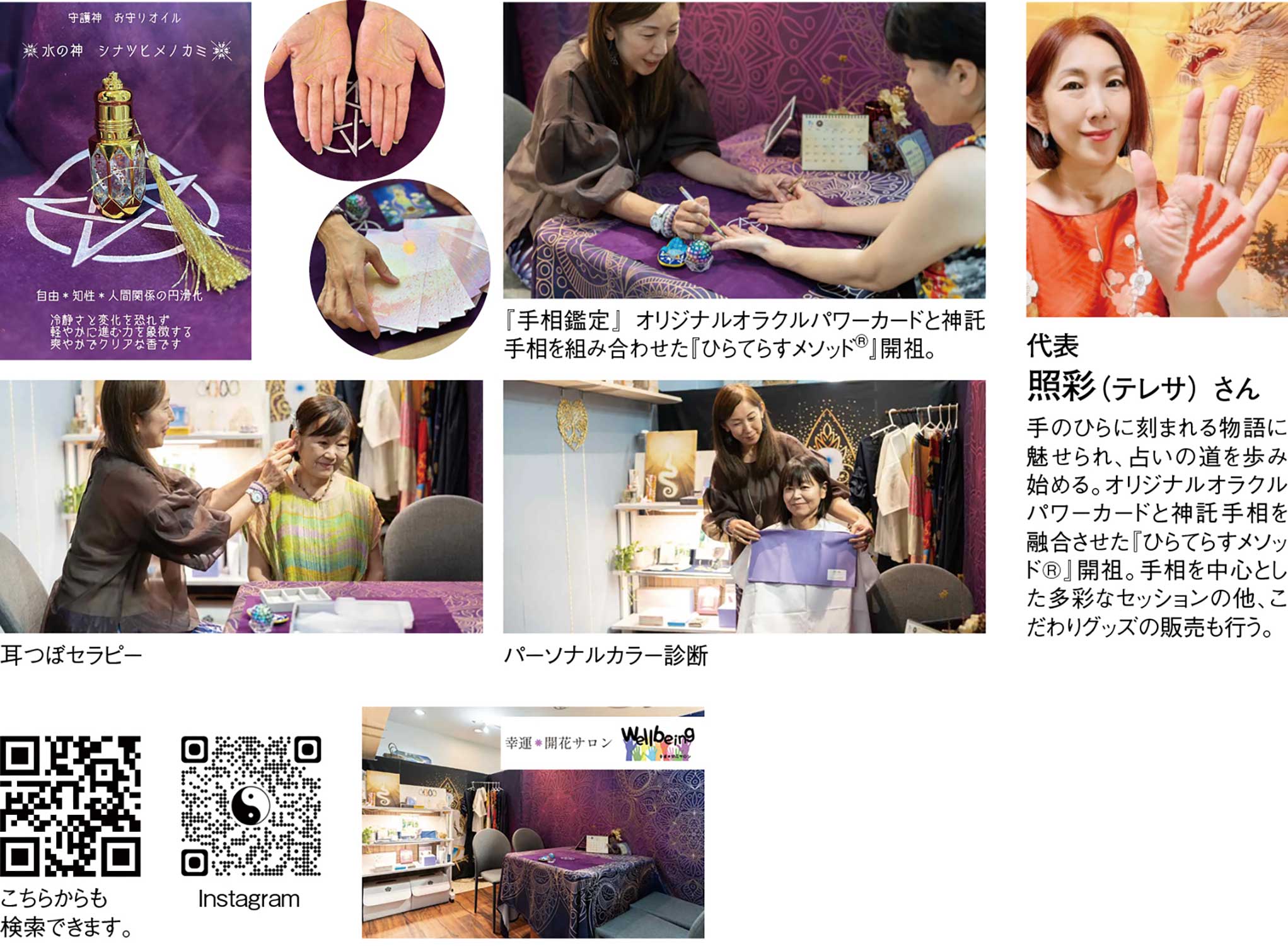 「ここに来れば幸せになれる、私らしさを引き出してくれる」、癒しの空間『幸運*開花サロン Wellbeing』代表で手相鑑定士の照彩さんは、『神託手相鑑定』を中心に、カードセッションや耳つぼセラピー、パーソナルカラー診断や心と身体のバランスを整えるヒーリングなど、様々な技法で訪れる方の幸運開花へとサポートしている。照彩さんが大切にしているのは、手のひらに刻まれた線や丘を「未来を当てるため」ではなく、「自分自身を知るため」のメッセージとして読み解く姿勢。照彩さんが編み出した『ひらてらすメソッドⓇ』では、オリジナルオラクルパワーカードと神託手相を融合させ、自分の内側にある可能性や本音に気づく時間を大切にしている。心が揺らいだとき、誰かに答えを委ねるのではなく、自分の手のひらが語る「私の可能性」に耳を澄ませる。そんな静かな対話の場として、多くの人の背中をやさしく押している。