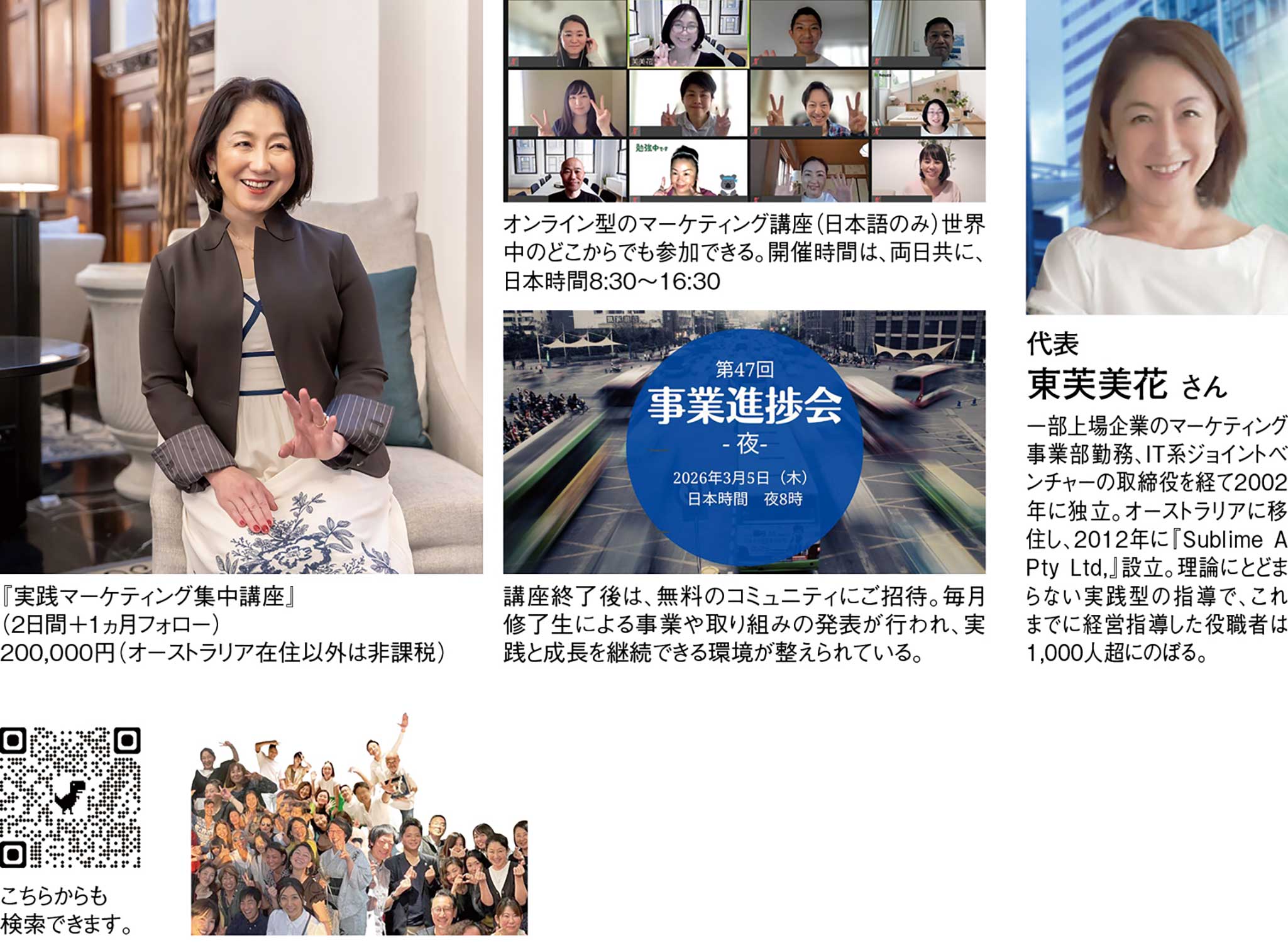 2日間という限られた時間の中で、ビジネスの全体像を一気に組み立て、その後の1ヵ月で実行と定着までを進めていく。本講座は、圧倒的なスピード感で思考と行動を前に進め、実際にビジネスを構築してしまうことを目的とした実践型のマーケティング集中講座だ。『Sublime A Pty Ltd,』代表の東芙美花さんは、一部上場企業で培ったマーケティング経験をもとに、既存の成功事例や理論をなぞるのではなく、参加者それぞれが置かれている市場背景や強み、環境条件そのものからビジネスモデルを立ち上げていく独自の講座プログラムを構築してきた。講座は少人数制のオンライン形式で行われ、対話と実践を重ねながら進行。顧客ニーズや市場機会を整理し、製品・価格・販路・販促といった要素を短期間で組み上げ、考えるだけで終わらせず、言語化し、形にすることで、2日間のうちにビジネスの骨格を完成させていく。講座終了後には1ヵ月間のフォローアップ期間が設けられ、構築したビジネスモデルを実行に移す中で生じる課題や迷いを、個別に整理しながら前に進めていくことができる。また、修了生の中からは、年商規模を大きく伸ばした人、海外在住という不利な条件の中から事業を飛躍的に成長させた人、まったく異なる分野へ転身し、第一線で活躍するようになった人など、次々と大きな成果を手にする成功者が継続的に生まれている。そうした修了生の変化と実績が紹介や口コミにつながり、広告に頼ることなく新たな参加者が集まるという、リファーラルを軸とした成長の循環が自然と築かれているのも本講座の大きな特徴だ。短期間で一気に構築し、その後も実践を重ねながら成長を続けていく。本講座は、スピードと結果の両立を本気で求める人のためのマーケティング集中講座だ。