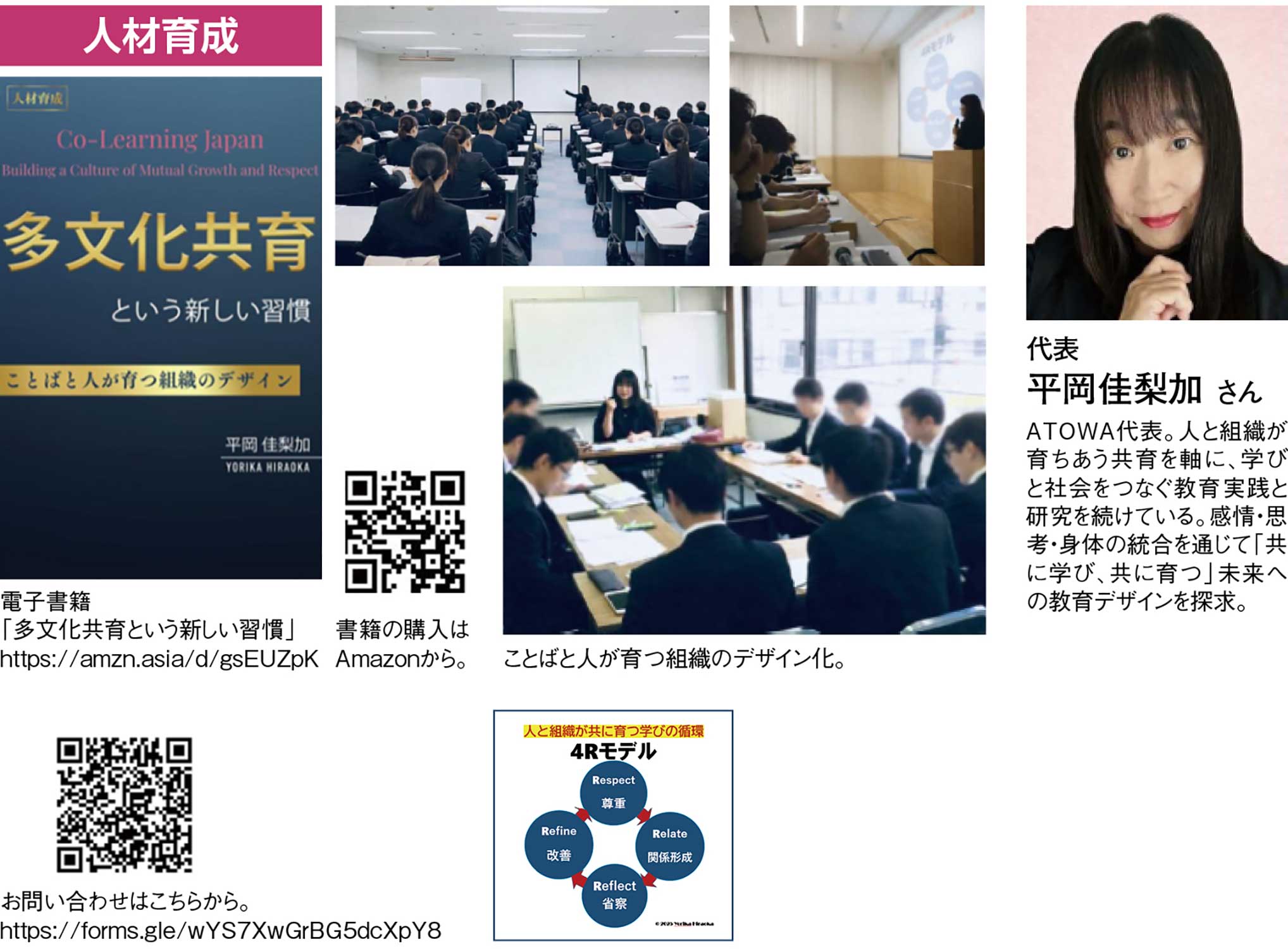 「多文化共育」は、違いをなくすのではなく、違いを前提に人と人、そして人と組織の関係を続けていくための実践的な考え方である。その原点には平岡さん自身の経験がある。平岡さんは娘と二人でモンゴルへ渡り、現地の大学で日本語教育を担った。一方、娘はモンゴル語の知識もないまま、現地の学校で学童期を過ごすことになった。未知の世界のただ中で、平岡さんと娘、そして現地の人々の間では教える側・教えられる側という単純な構図はすぐに崩れ、互いに支え合い、学び合いながら前へ進むしかなかった。こうした「育て合う、共に学ぶ」体験を核に、平岡さんは教育現場から企業研修、行政や自治体の現場まで多文化が交わる場を横断し、延べ1万5千人以上と向き合ってきた。その中で人材育成の課題の多くが、個人の性格ではなく、前提や構造から生まれるという共通点を掴んでいったという。平岡さんは、互いを尊重する「Respect」、関係を結び直す「Relate」、出来事を振り返る「Reflect」、次の行動を整える「Refine」を循環させる「4Rモデル」を提示。「共育」を軸に、個人と組織がともに育つ仕組みを設計する学びのデザインを追求している。