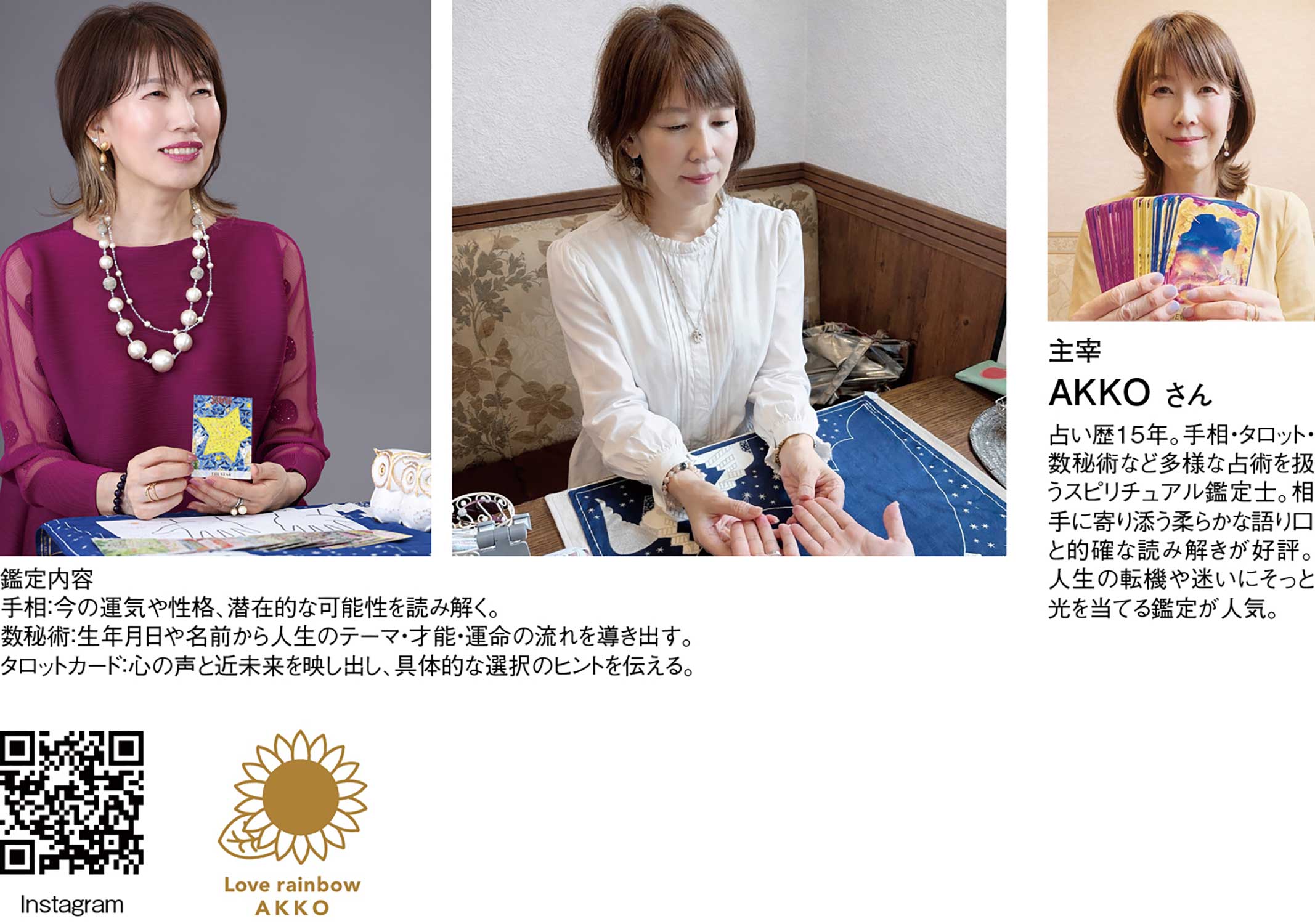 『Love rainbow AKKO』では、手相・タロット・数秘術など、複数の占術を組み合わせることで、一人ひとりに寄り添った丁寧な鑑定を行っている。占い師のAKKOさんは、4500人以上の方々の人生に寄り添い、手相・数秘術・タロットカード・フルネーム言霊を通じて、その方らしい生き方や未来のヒントをお伝えし、画一的なアドバイスではなく、今の抱えている悩みや不安、未来への迷いに合わせて、最適な占術を選び出し、多角的な視点から読み解くのが特長だ。手相では、その人が持つ生まれながらの性格や才能、人生の流れを把握し、タロットでは今の状況や近未来の動きを明確にする。さらに数秘術を組み合わせることで、あなた自身の使命や人生のテーマを深く知ることができる。「何を選べばいいかわからない」「このままでいいのか不安」占いは自分の内側を見つめ、未来へ一歩踏み出す大きなヒントになり、目の前の悩みだけでなく、あなた本来の魅力や可能性にも光を当てていく。鑑定後に心が軽くなり、前に進む勇気が湧くようなメッセージを伝えるのがAKKOさんのスタイル。対面・オンライン問わず、安心して相談できる雰囲気が人気を集めている。相談者が自分自身と向き合い、日常の中で実践できる行動アドバイスを丁寧に提案してくれるのも魅力。鑑定後のフォローも手厚く、「話すだけで気持ちが整う」とリピーターが多い理由にもなっている。