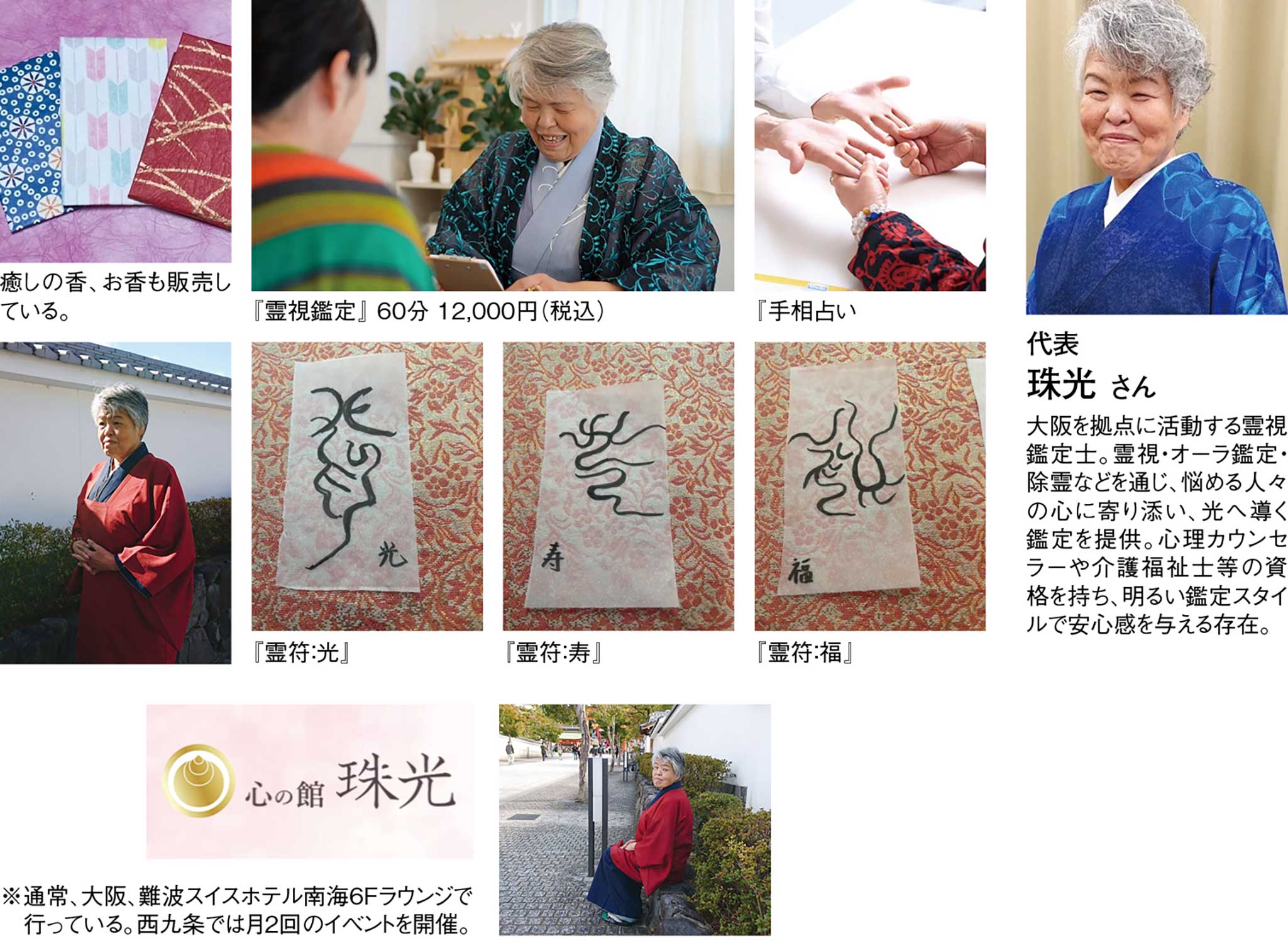 霊視占いサロン『心の館 珠光』は、霊視やオーラ鑑定・除霊などを通じて、心のモヤモヤや悩みを解きほぐし、前向きな未来への一歩をサポートする鑑定所。代表の珠光さんは、明るく楽しい雰囲気を大切にしながら、亡くなった家族やご先祖様とのメッセージを受け取り、お客様へそのままお伝えするスタイルの鑑定を行っている。言葉にできなかった感謝や思いを受け取った瞬間、涙と安堵があふれ出すといった体験談も多数寄せられている。