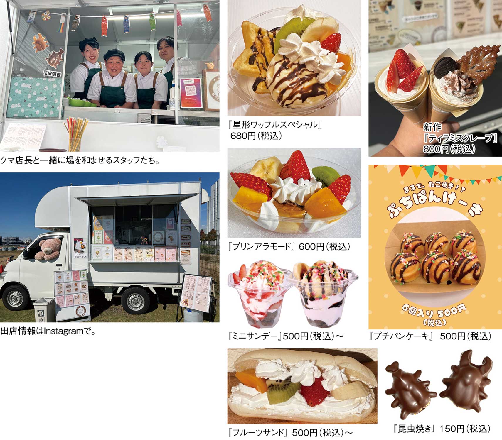 車窓から顔をのぞかせるクマ店長の存在が場を和ませ、子どもから大人まで自然と笑顔にしてくれる。訪れるたびに限定メニューや新しい組み合わせが登場し、何度足を運んでも飽きさせない工夫が光るキッチンカーだ。甘いひとときを共有する場として、人と街をつなぐ存在としても注目したい。出店情報をチェックし、出会えたらぜひ立ち寄ってみてほしい。