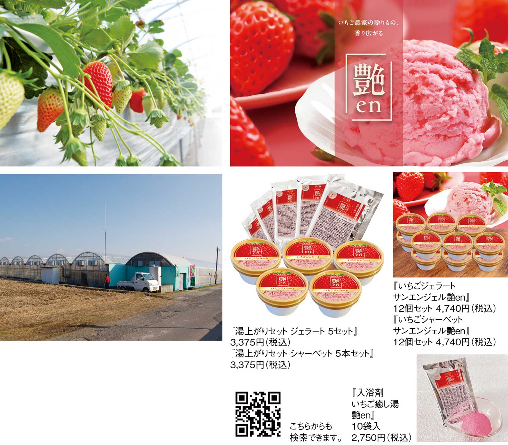 さらに意外性で驚かされるのが入浴剤『いちご癒やし湯 艶en』。いちご果実エキスに、保湿を支えるコラーゲンやヒアルロン酸などを配合し、湯上がりの肌をしっとり包み込む。ジェラートと入浴剤を組み合わせた『湯上がりセット』も用意。食べて、冷やして、浸かって、いちごの艶を三方向から味わいたい。贈り物にも映える。