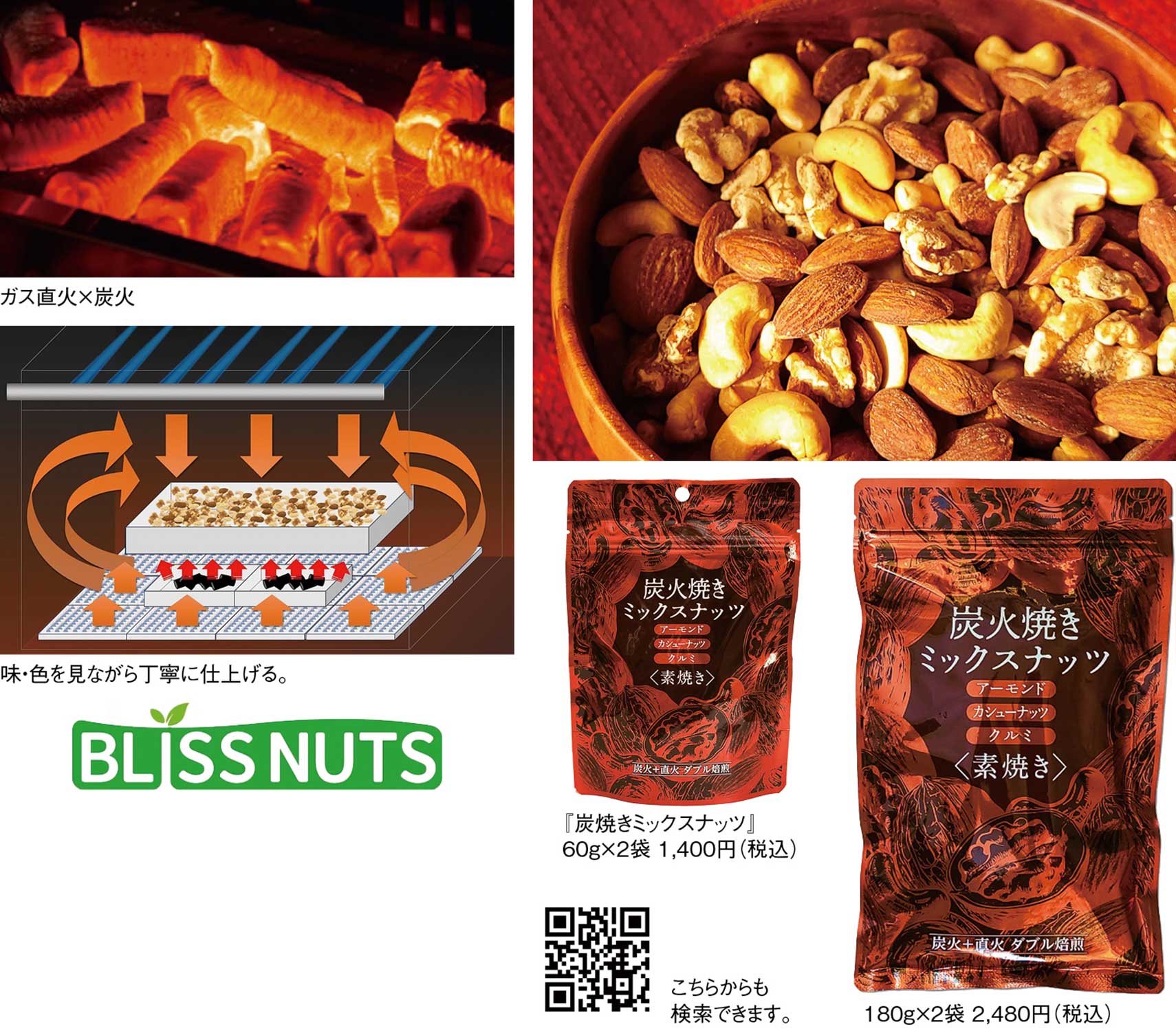 袋を開けた瞬間に広がる香ばしさ。その一粒が、想像以上に満足感をくれる。『株式会社ブリスナッツ』の『炭火焼きミックスナッツ』は、直火と炭火を組み合わせた独自のW焙煎で、ナッツの甘みと香ばしさを最大限に引き出したクラフトナッツだ。アーモンドは香ばしく、カシューナッツは甘みがふくらみ、クルミは深いコクがでる。三種のナッツが同じ製法で焼かれているのに、それぞれが驚くほど個性的な味わいを見せていることが面白い。