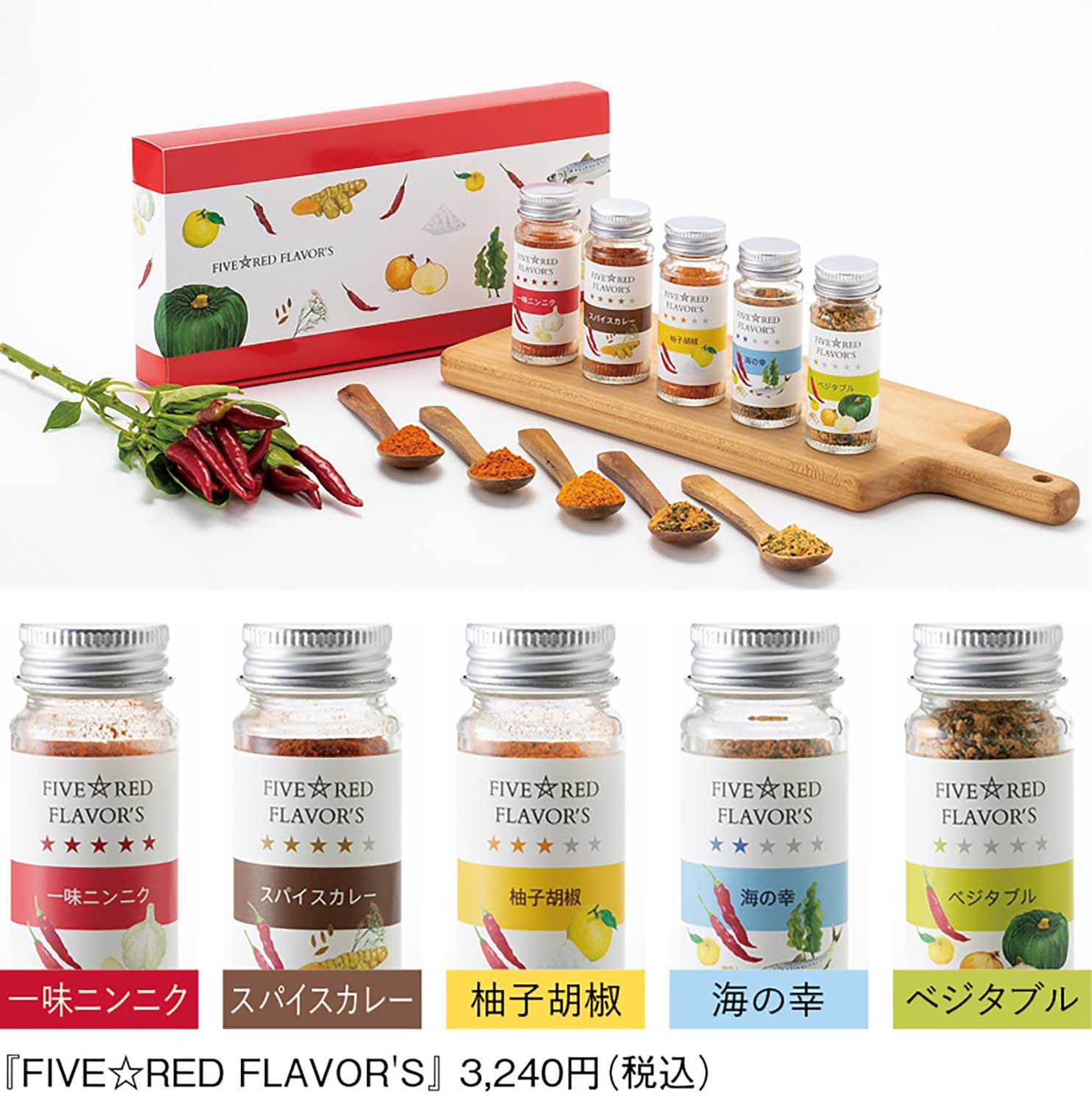 茨城県・筑波山麓で無農薬栽培された香り豊かな「筑波八ツ房唐辛子」「福来みかん」を使い、5種のスパイスを詰め合わせた『エコファーム飯島』の『FIVE ☆RED FLAVOR'S』。5種のスパイスを料理ごとに使い分けられることが魅力。辛さは★の数で段階表示。代表の飯島朗さんは、「この★には、近くに安倍晴明生誕の地があることから、魔除け、開運の願いを込めて、さらに5種のスパイスがどんな料理に合うかと家庭でのコミュニケーションにつなげてほしいと製品化した」と語る。贈り物としても最適だ。