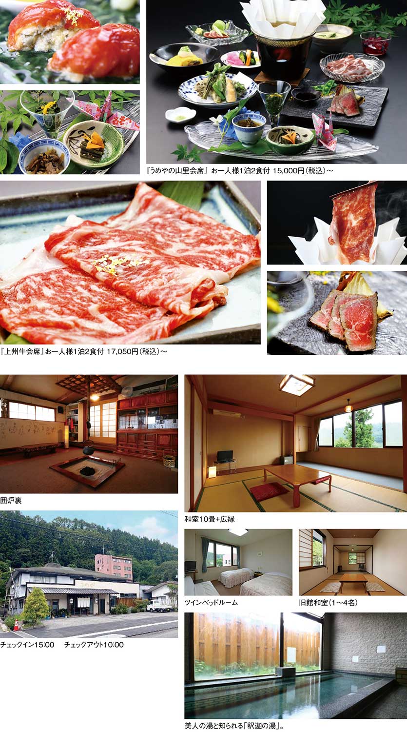 また、国道沿いに点在する「花咲の湯」、日本百名山・武尊山の麓に広がる「武尊牧場」、冬には「丸沼」「片品」「岩鞍」など多くのスキー場が営業し、季節ごとにテーマを変えて旅が組み立てられるのが片品の魅力。観光後に宿へ戻り、湯で疲れをほぐせるのも嬉しい。 自然観光と温泉、素朴な山里料理。この地域ならではの魅力を過不足なく味わえる宿として、『うめや』は片品旅の良き拠点になってくれる。