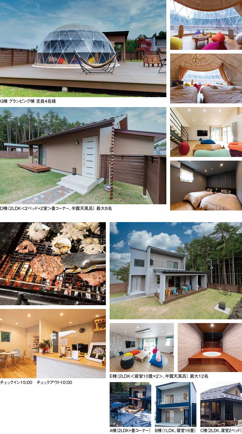 富士山麓・富士河口湖町の静かな森に佇む『VILLA BONDS』。全棟が戸建てタイプの完全独立型コテージで、周囲の視線を気にせず、仲間や家族との時間にどっぷり浸れる小さなリゾートだ。客室はA~Eの5棟に加え、ドーム型テントが目を引くグランピング棟Gも用意。棟ごとに間取りや設えが異なり、カップルの気軽な滞在から三世代旅行、グループ合宿まで受け止めてくれる。