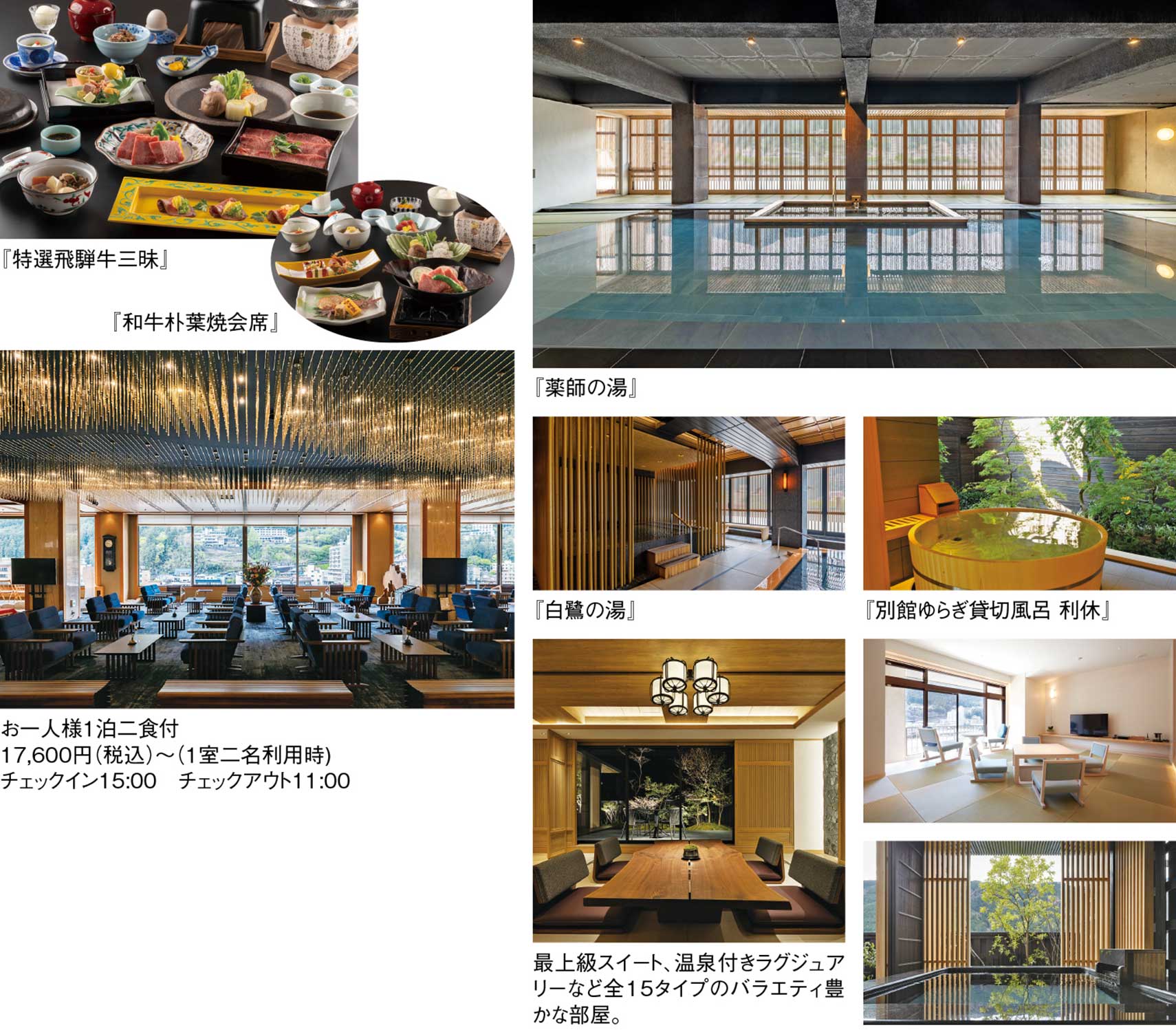 また、地元の名産品、四季折々の旬の食材を使用した創作和食会席も魅力の一つ。特に全国にファンが多いブランド牛「飛騨牛」は、A4等級以上のみに拘って使用。下呂駅から徒歩約7分というアクセスの良さも、週末旅にちょうどいい。館内は和の趣と現代的な快適さが調和した落ち着いた空間で、ロビーやラウンジからも飛騨川の景色を楽しめる。