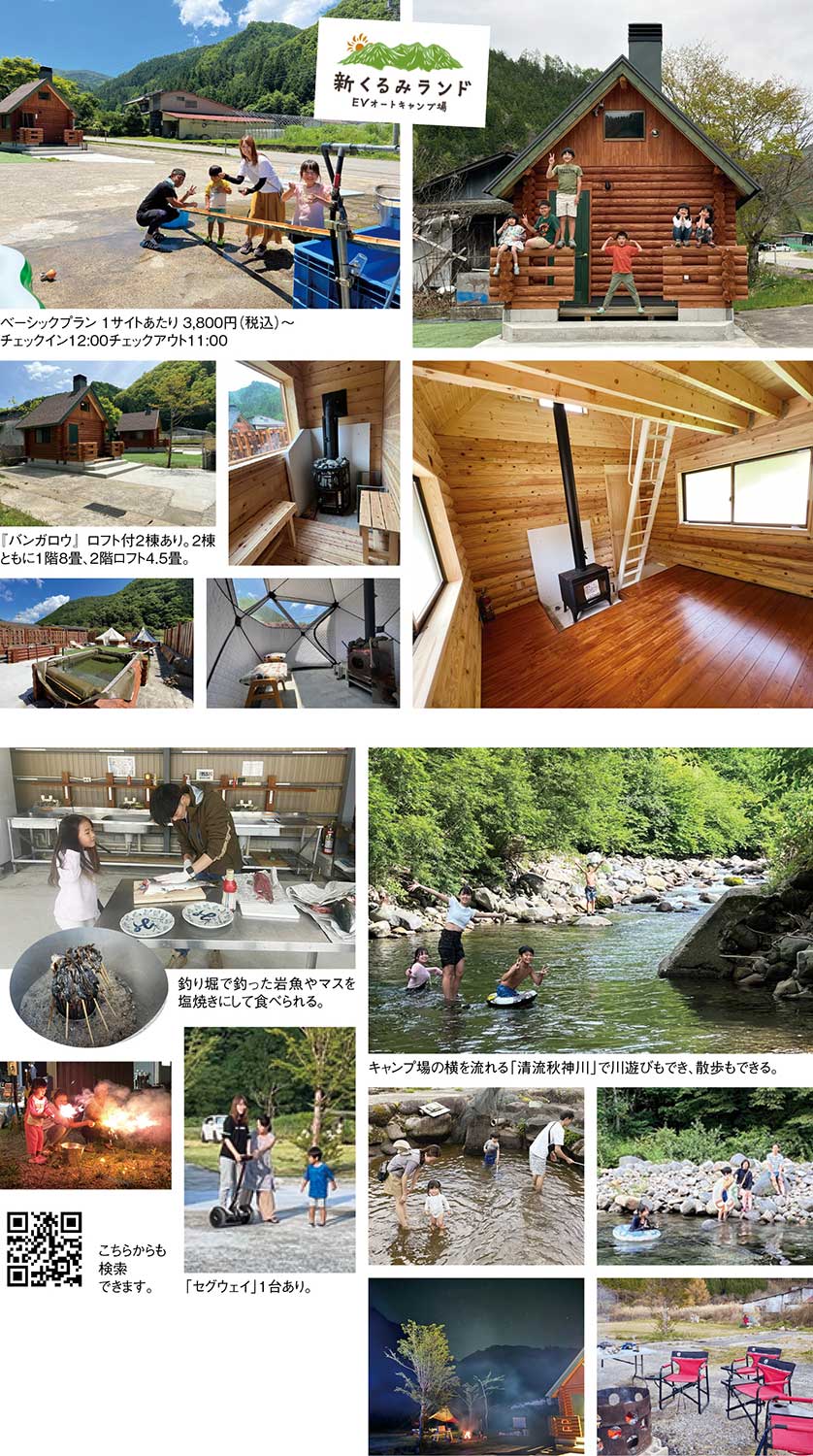 岐阜県高山市の山あい、標高約千メートルの高所に開けた『新くるみランド』は、清流・秋神川の流れと満天の星空を一度に味わえるキャンプ場だ。市街地の喧騒から距離を置いた立地ゆえ、夜になると空気は一段と澄み、見上げれば星が降るように広がる。春は芽吹きと桜、夏は深い緑と川遊び、秋は紅葉、冬は雪景色と、飛騨高山らしい四季の移ろいが、そのまま滞在の背景になる。新しい四つを含めた全16の芝生のオートサイトを中心に、電源付きサイトやEV対応サイトも用意されている。また、薪ストーブを備えたバンガローやロフト付きタイプもあり、天候やスタイルに応じて宿泊方法を選ぶことができる。もちろん、テントやタープ、チェア、調理器具などのレンタルも揃い、手ぶらOK。秋神川沿いの散策や川遊び、釣り堀で釣った岩魚やマスをその場で塩焼きにする体験など、自然の中で過ごす時間そのものが、このキャンプ場の大きな魅力になっている。また、木造個室貸切サウナとテントサウナを備え、いずれも薪ストーブを使ったセルフロウリュ仕様。温度は高めに設定され、しっかりと汗をかいた後は、9度以下の天然水を使った水風呂へ。冷たさの輪郭がはっきりした水に身を沈め、外へ出れば、そこには人工物の少ない夜の森と星空が広がり、ただ静かに外気に身を預ける時間が、キャンプ場という環境と自然に溶け合う。シャワー室や貸切風呂も整備。サウナを特別な目的にせず、キャンプの流れの中に無理なく組み込めるのもうれしい。昼は川や森で身体を動かし、夕方から火を起こし、夜にサウナと星空を楽しむ。翌朝は澄んだ空気の中でコーヒーを淹れ、ゆっくりと撤収する。そんな一連の過ごし方が自然と想像できる。周辺には、古い町並みや朝市で知られる高山市中心部をはじめ、車で足を延ばせば奥飛騨温泉郷の温泉地も点在し、白川郷・上高地・下呂温泉・濁川温泉も約1時間くらいで行くことでき、御嶽山・乗鞍岳は朝早く出発すると頂上までの日帰りが可能。夏には8㎞のハイキングコース、冬にはそり遊びコースを楽しむことができる。観光地を巡ったあと、夜は静かなキャンプ場に身を置くという使い分けも可能で、観光とアウトドアの間を行き来する拠点としても使い勝手がいい。キャンプ場でありながら、自然体験、快適な設備、そして薪サウナという要素が無理なく共存している『新くるみランド』。山に泊まるという行為を多層的に楽しませてくれる場所として、記憶に残る滞在を用意してくれる。